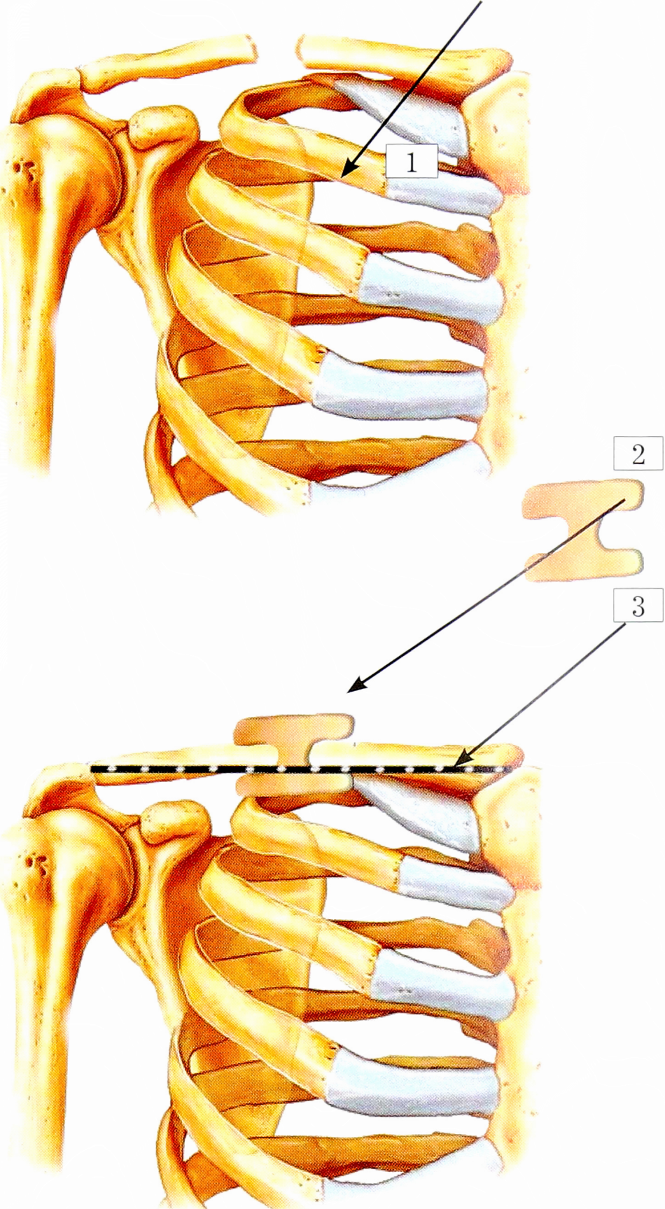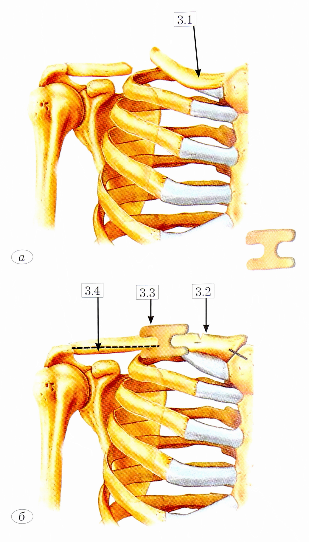 - замещение дефекта ключицы костными аутотрансплантатами из гребня подвздошной кости, ребер, малоберцовой кости, бугристости большеберцовой кости [20—24].