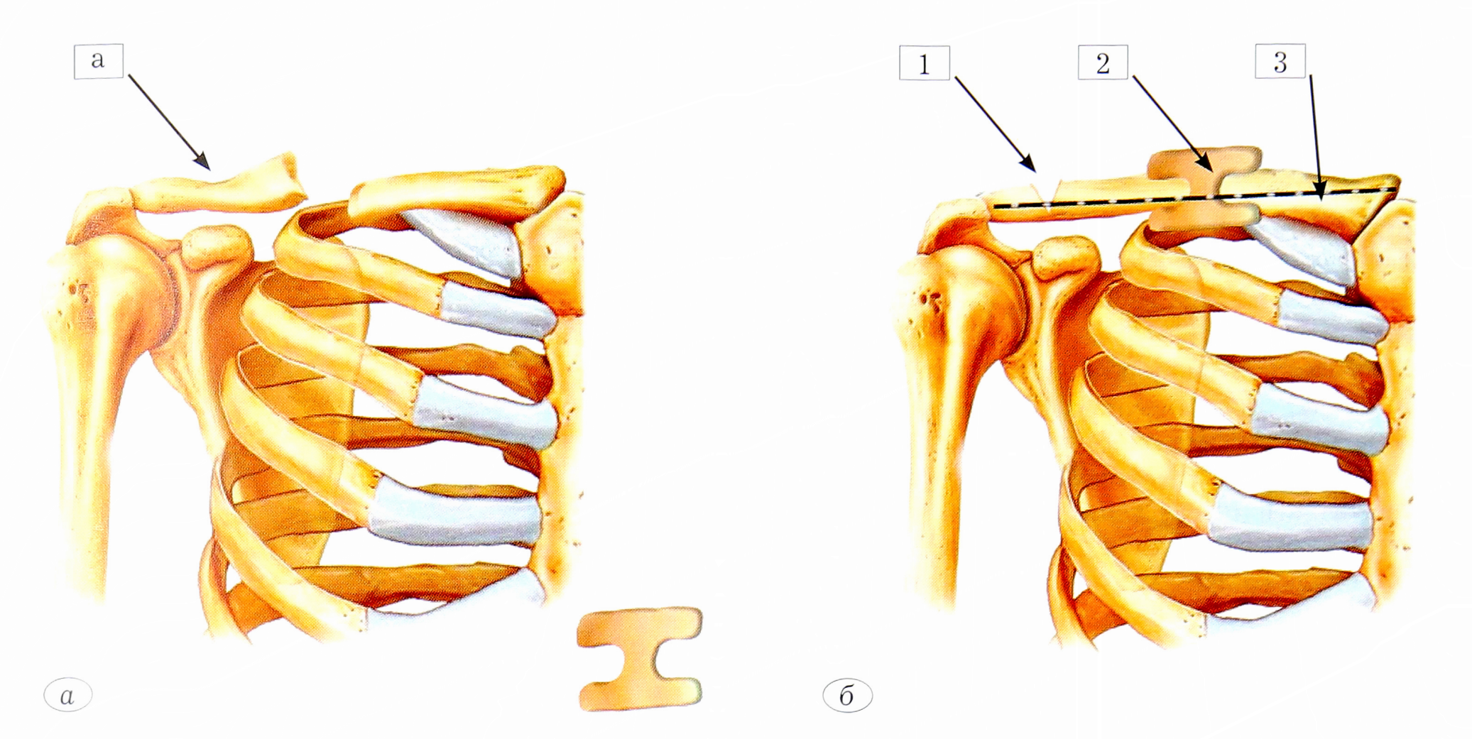 Рис. 2. Врожденный ложный сустав ключицы с деформацией акромиального фрагмента.а — акромиальный конец ключицы с отмеченной стрелкой вершиной деформации; б — схема операции: 1 — область кортикотомии фрагмента; 2 — «Н»-образный аутотрансплантат; 3 — интрамедуллярная фиксация спицей.