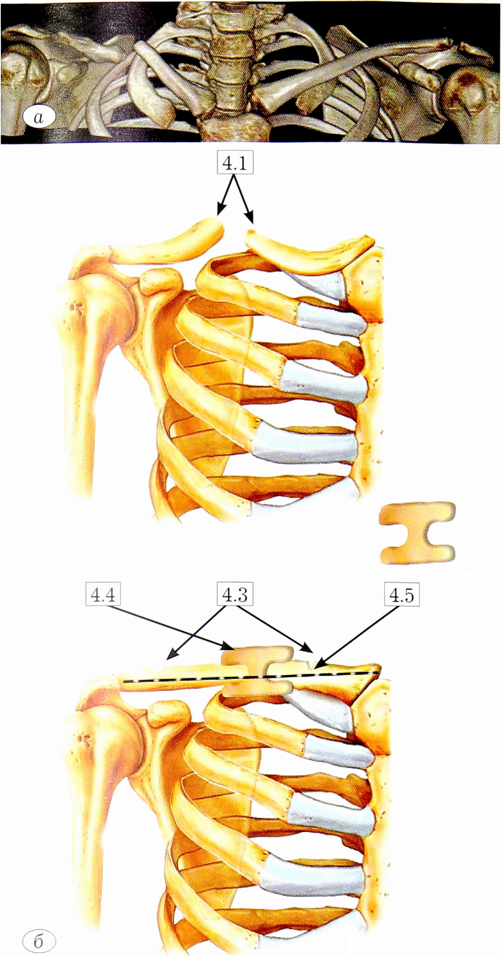 Рис. 4. Хирургическое лечение пациента с деформацией обоих фрагментов ключицы. а — компьютерная томограмма врожденного ложного сустава ключицы с деформацией обоих фрагментов: 4.1 — вершины деформации костных фрагментов ключицы; б — ВЛСК с деформацией акромиального и стернального фрагментов. Схема операции: 4.2 — вершина деформации; 4.3 — область кортикотомии фрагмента; 4.4 — «Н»-образный аутотрансплантат; 4.5 — интрамедуллярная фиксация спицей.