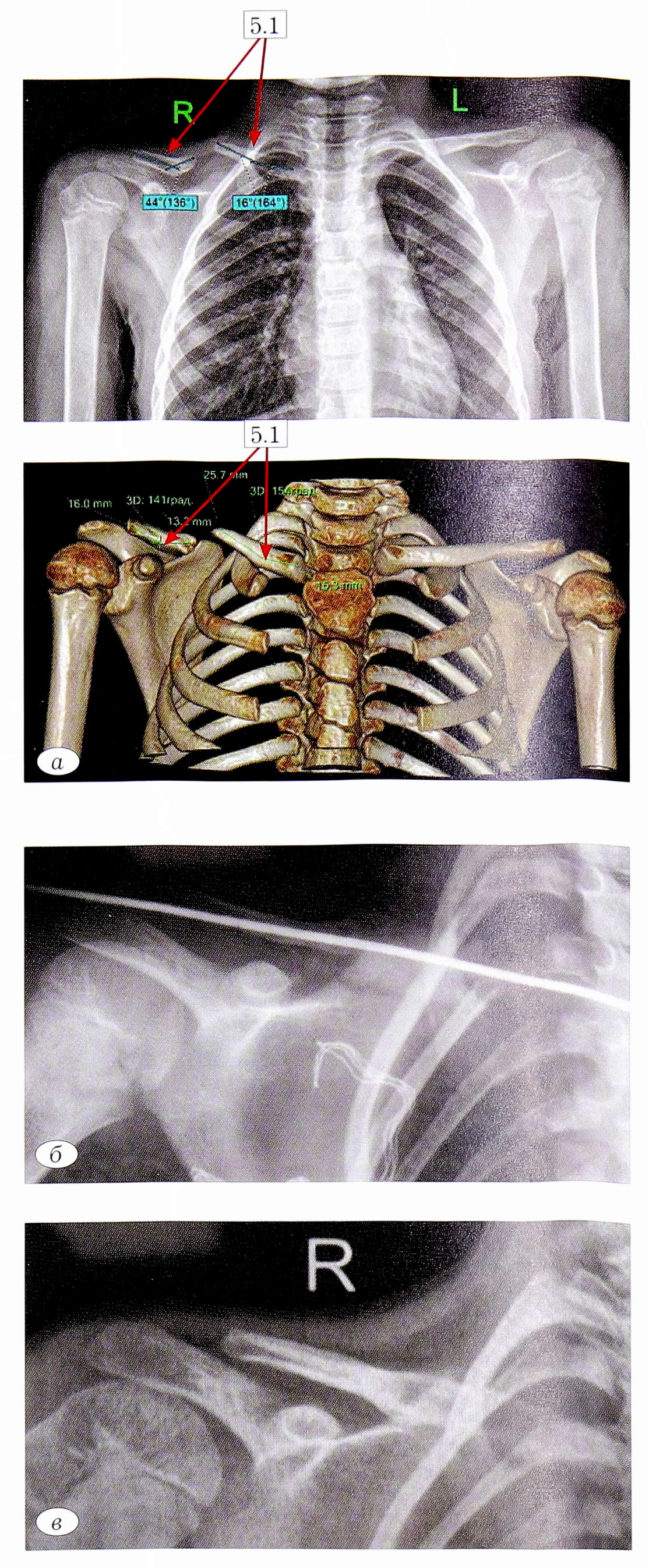 Fig. 5. Patient I. Clinical observation. Radiograph and CT scan before treatment (5.1 — vertex deformationfunctions of fragments of the clavicle); b — x-ray intraopration; in the radiograph 1 year after surgery.