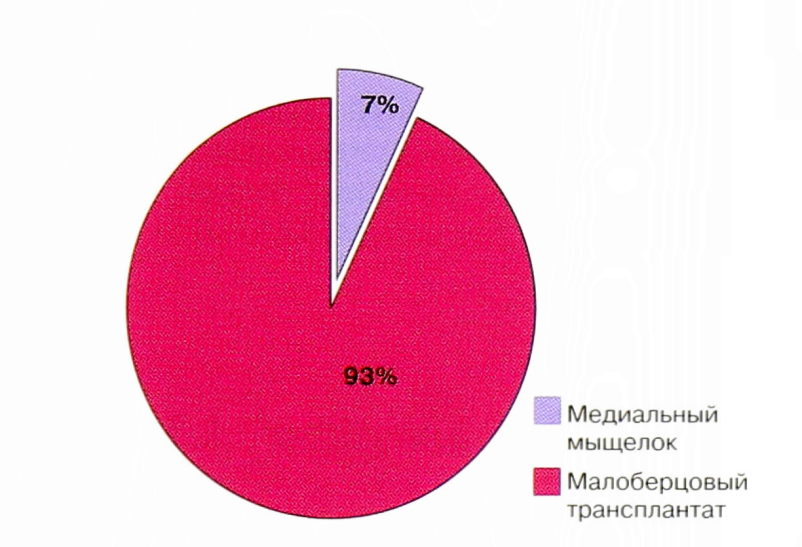 Кровоснабжаемый трансплантат из малоберцовой кости использовался у 38 (93%) пациентов, васкуляризованный трансплантат из медиального мыщелка бедренной кости — у 3 (7%) пациентов (рис. 1).