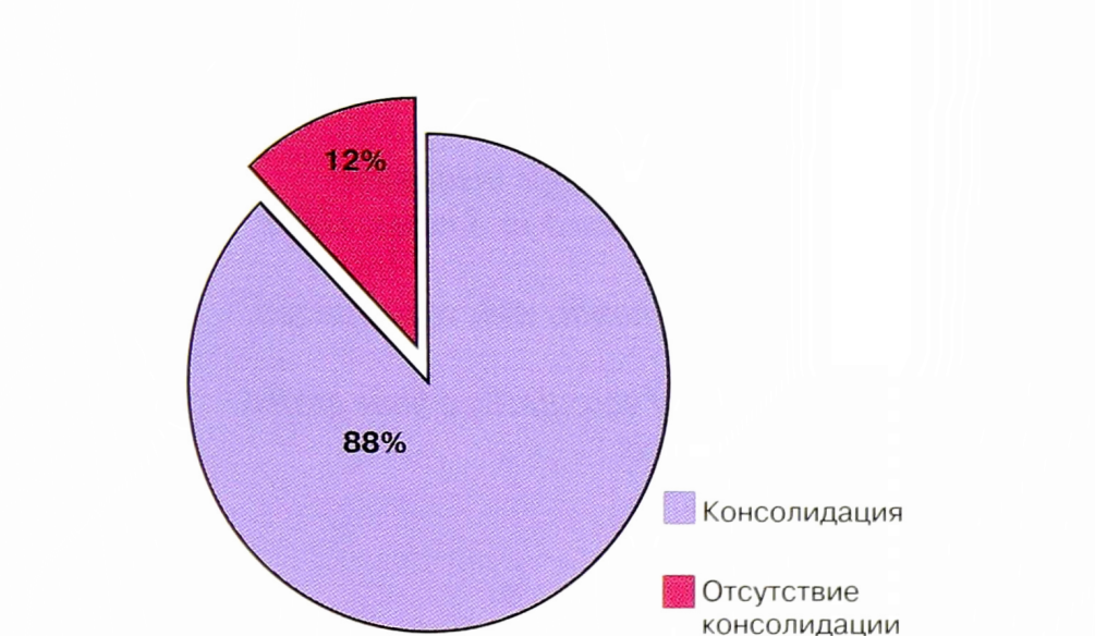 Консолидация перелома при кровоснабжаемой костной пластике была достигнута в 36 (88%) случаях в течение 4-6 мес (рис. 2): в группе применения малоберцового трансплантата консолидация была достигнута в 33 случаях, в группе трансплантата из мыщелка бедренной кости — в 3 случаях.