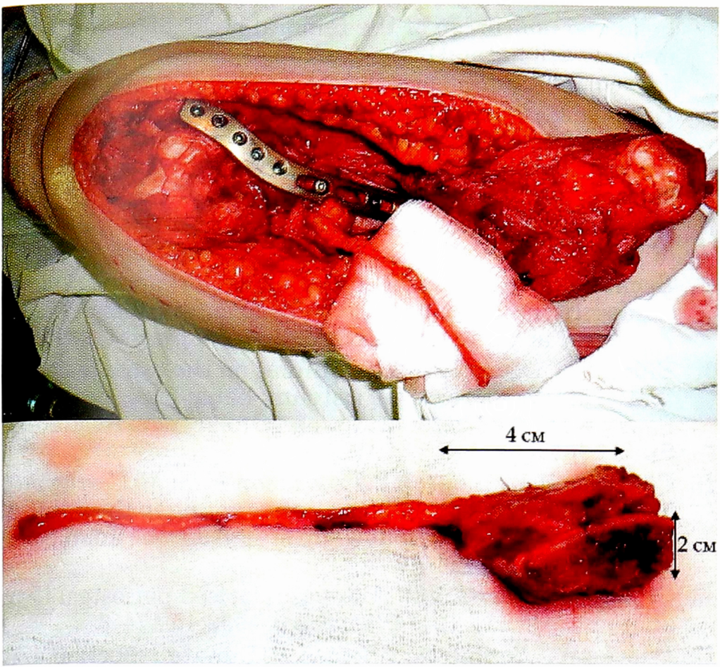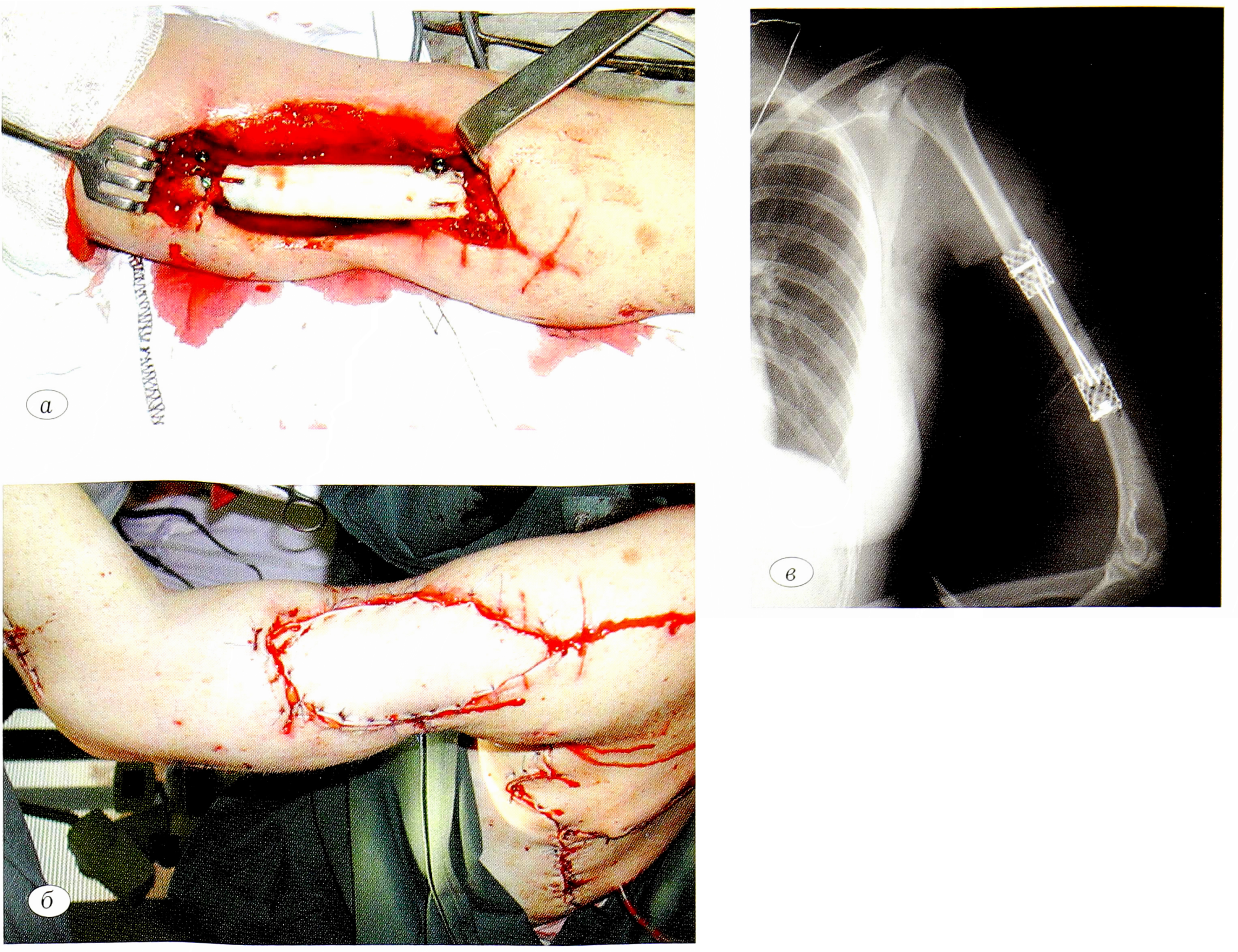 Рис. 11. Пациентка H. Оперативное лечение: резекция зоны ложного сустава левой плечевой кости, остеосинтез пластиной и винтами. Пластика свободным кровоснабжаемым трансплантатом из внутреннего мыщелка бедренной кости.