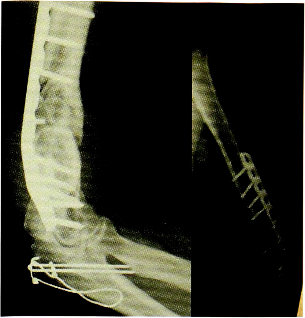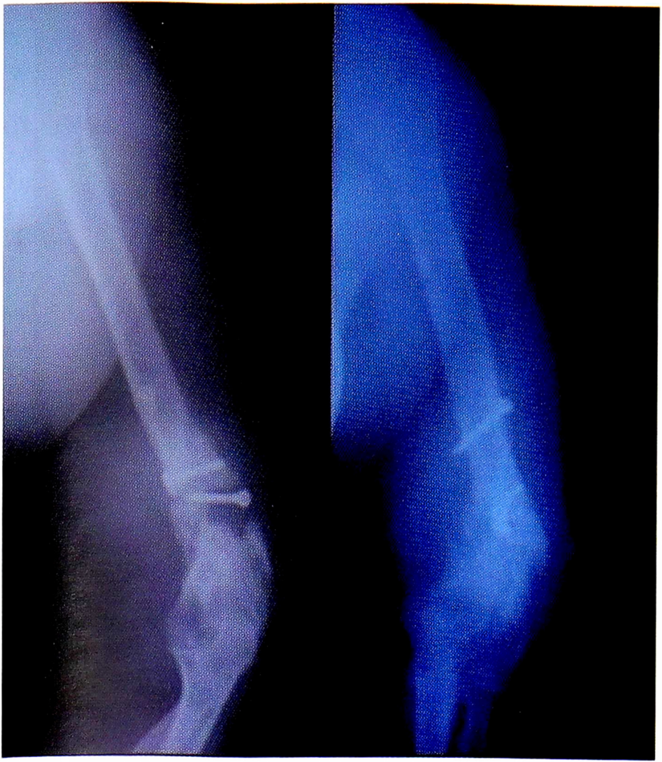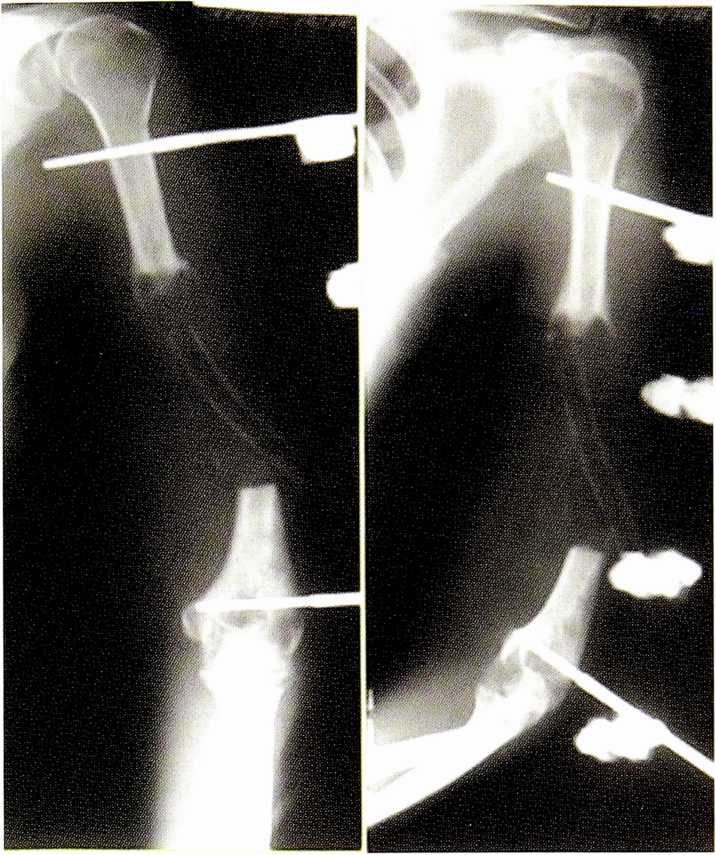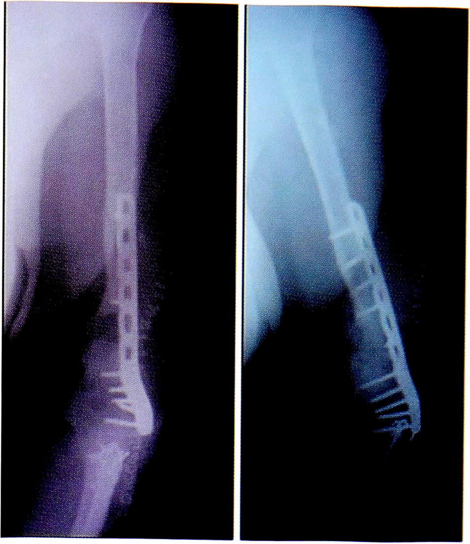 Fig. 11. Patient N. Surgical treatment: resection of the zone of the false joint of the left humerus, osteosynthesis of the plasty and screws. Plastic free perfused TRANSplantation from the internal condyle of the femur.