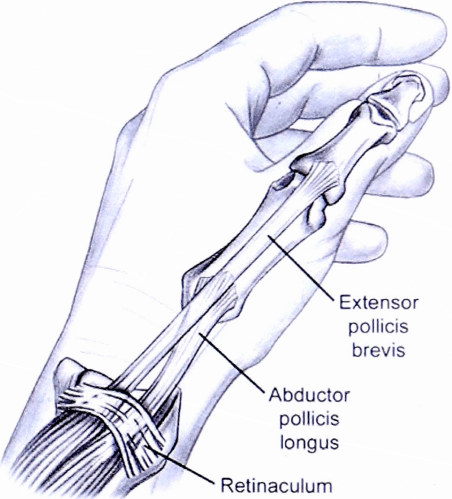 При осуществлении различных захватов с участием большого пальца первый костно-фиброзный канал действует, по сути, как блок, направляя сухожилия т. abductor pollicis longus и т. extensor pollicis brevis к фалангам пальца. В норме эти сухожилия плавно и гладко скользят в сухожильном влагалище, где находится синовиальная жидкость. Длительная, повторяющаяся нагрузка на 1 палец или постоянные монотонные движения в виде сгибания-разгибания, отведения пальца вызывают высокие перепады внутриканального давления.