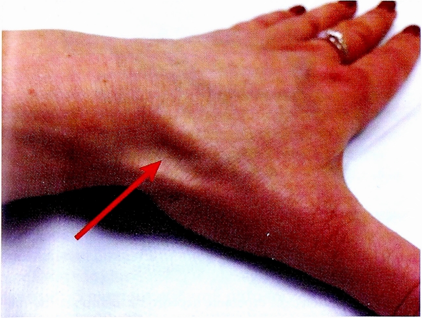 В области первого тыльного канала иногда могут наблюдаться небольшой отек и покраснение. Феномен «щелканья» при этом заболевании встречается очень редко, однако при пальпации области первого тыльного канала определяются болезненность, маленькие узелки и утолщенные сухожилия разгибателей I пальца, иногда ощущается «скрип» сухожилий.