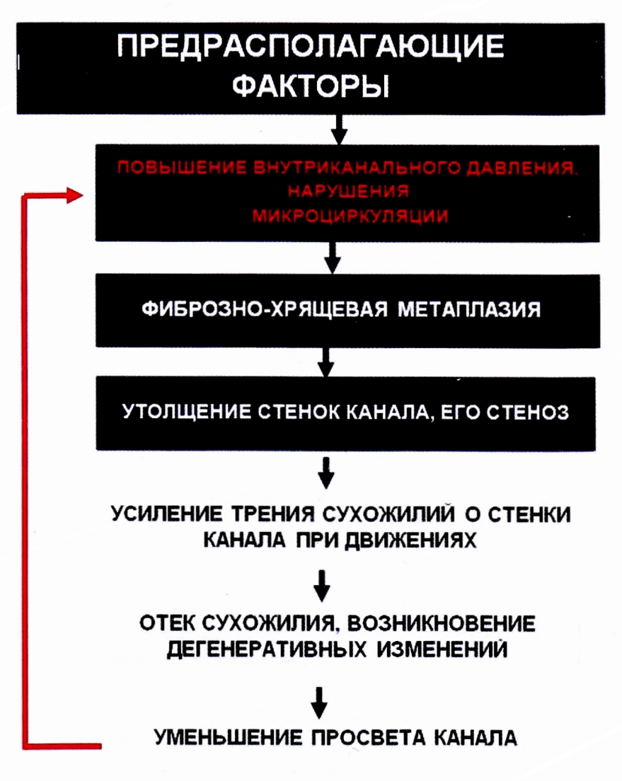 Уменьшение просвета канала приводит к усилению трения сухожилий, проходящих в нем, о его внутреннюю стенку. Хроническую травматизацию сухожилия при его движении через суженый канал можно сравнить с истиранием нити, многократно проходящей через игольное ушко.