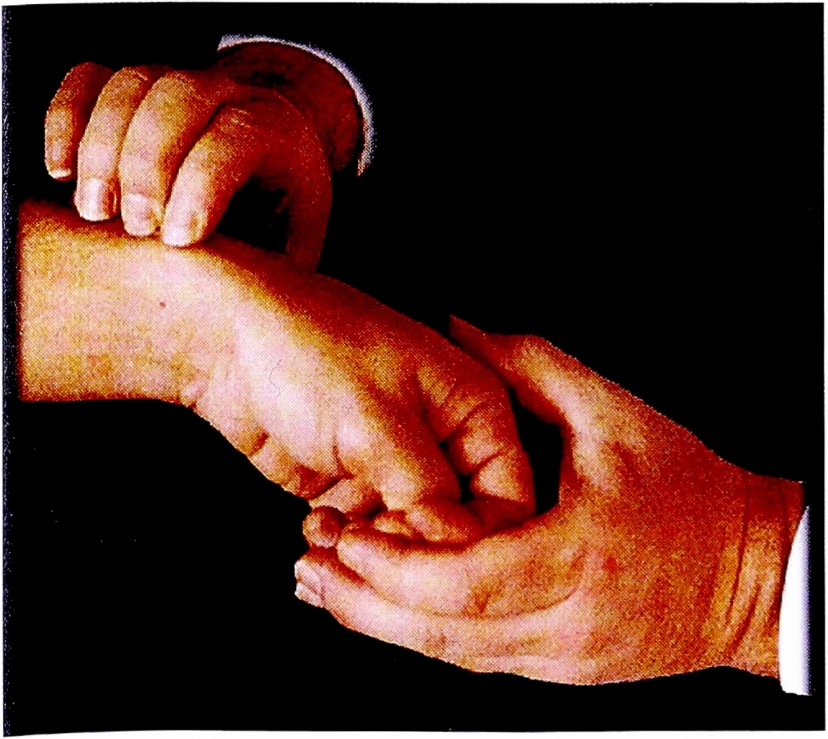 Для уточнения диагноза используют провокационные тесты: активные и пассивные круговые движения I пальцем и тест Финкельштейна, который является специфическим для данного заболевания. В основе теста лежит пассивное натяжение сухожилий разгибателей I пальца. Техника выполнения теста (рис. 5): пациент приводит I палец к ладони, сгибая его в дистальном и пястно-фаланговом суставах. Другие пальцы сжимаются в кулак, обхватывая при этом I палец. После этого врач производит пассивное отведение запястья в локтевую сторону (по направлению к мизинцу). Усиление болей у основания I пальца и по лучевому краю запястья подтверждает диагноз. Результаты теста сравнивают с контралатеральной рукой. Этот признак дифференцирует заболевание от ризартроза.