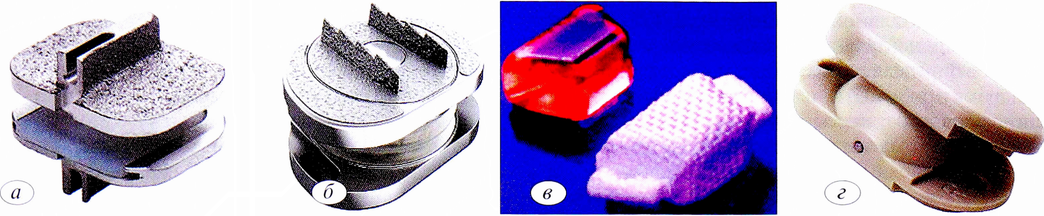 Fig. 1. Implants for anterior dynamic fixation of the lumbar spine. a — ProDisc; б — M6-Lumbar; в — PDN-Raymedica; г — NUBAC.