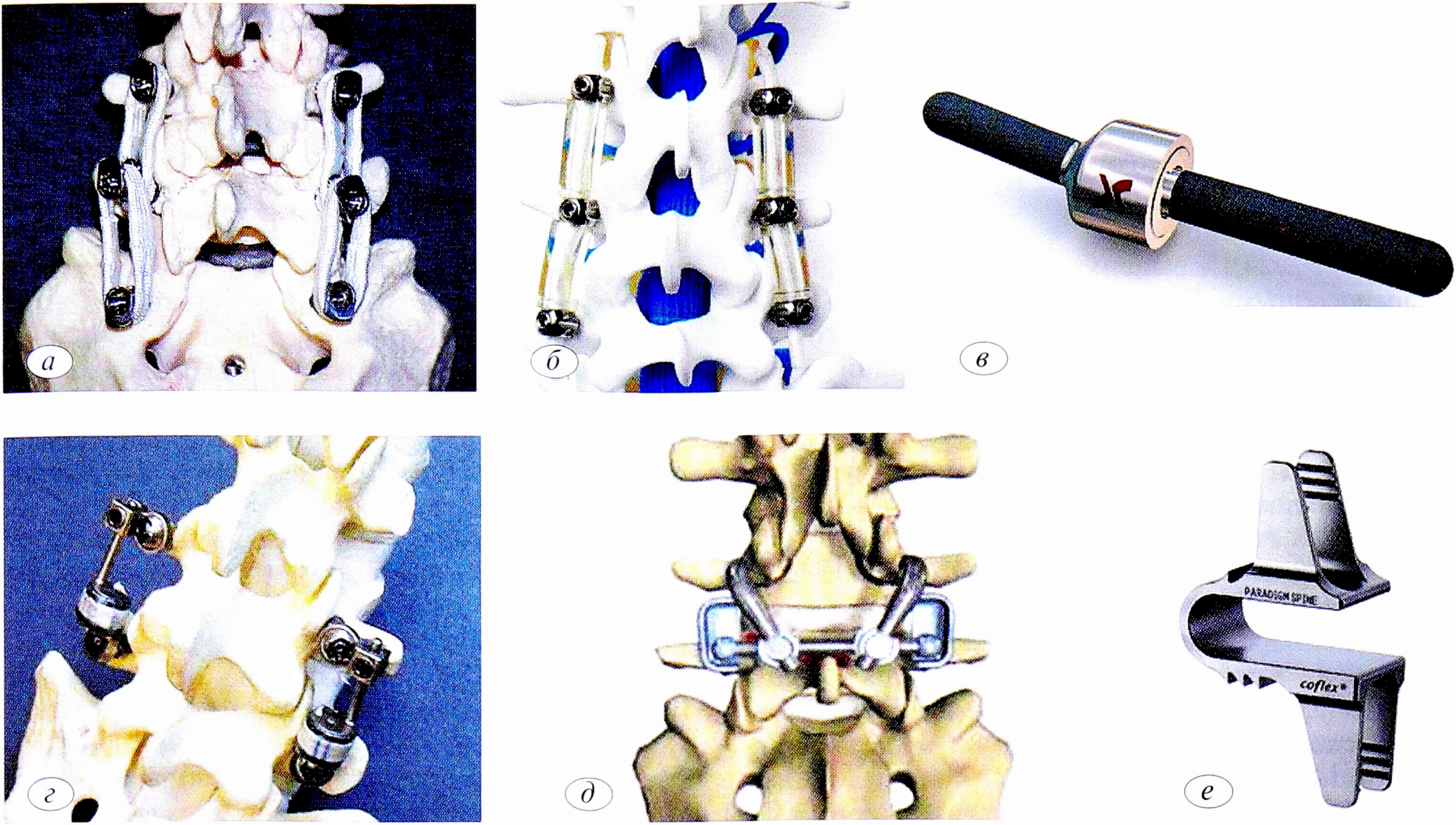 Fig. 2. Implants for posterior dynamic fixation of the lumbar spine. a — ligament fixation system Graf; б — dynamic stabilization system Dynesys; в — dynamic rod Isobar TLL; г — system Stabilimax NZ for the improvement of facet joints function; д — system TFAS for total replacement of facet joints; e — posterior interspinous stabilization system Coflex.