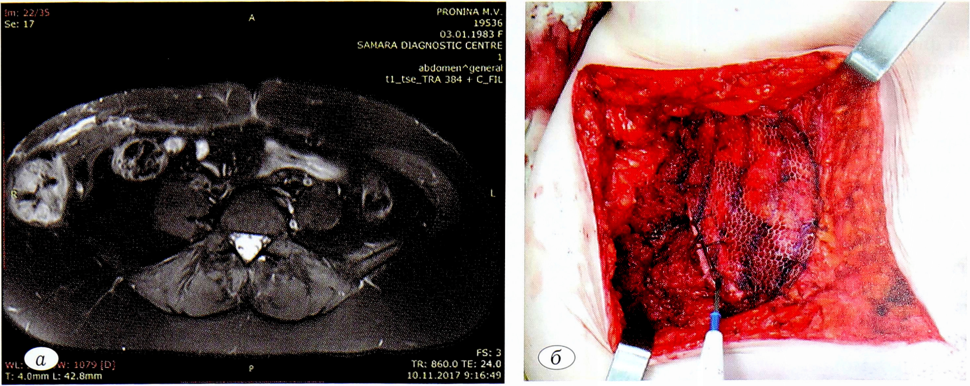 Fig. 1. Patient Р.,34 years old. Diagnosis: Desmoid fibroma of the anterior abdominal wall on the right with the spread to the wing of the right Ilium. Condition after combined treatment in 2010 in Samara (surgical treatment + LT SOD 46 G). Relapse of the disease. Condition after non-radical surgical treatment. a-DF of soft tissues of the right iliac region; b-reconstruction of the surgical defect by composite mesh.