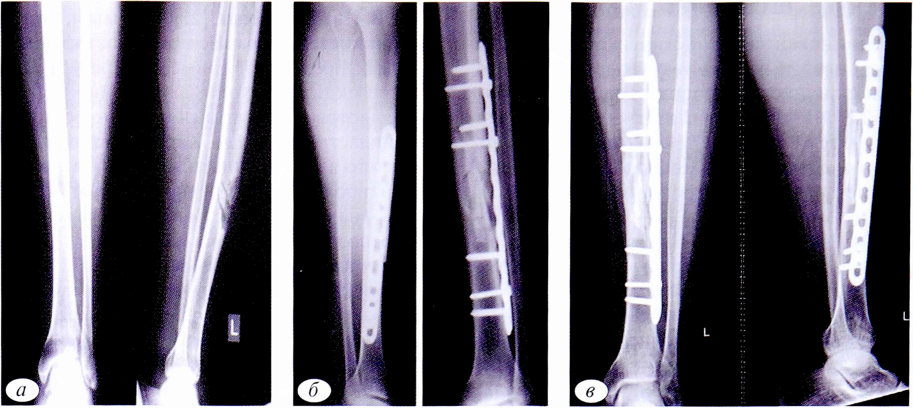 10. Fig. 9. Patient А.,18 years old. Diagnosis: pathological fracture of the left tibia against the background of hemangioma. a — radiographs of the left tibia in 2 projections before surgery; б — radiographs of the left tibia in 2 projections after the operation: marginal resection of the left tibia, alloplasty, osteosynthesis with a plate and screws; в — radiographs of the left tibia in 2 projections, the result after 16 months. X-ray consolidation of the fracture, inorganotypic restructuring of the grafts is noted. There are no signs of a relapse of the disease.