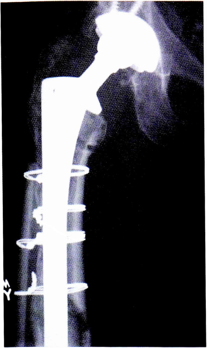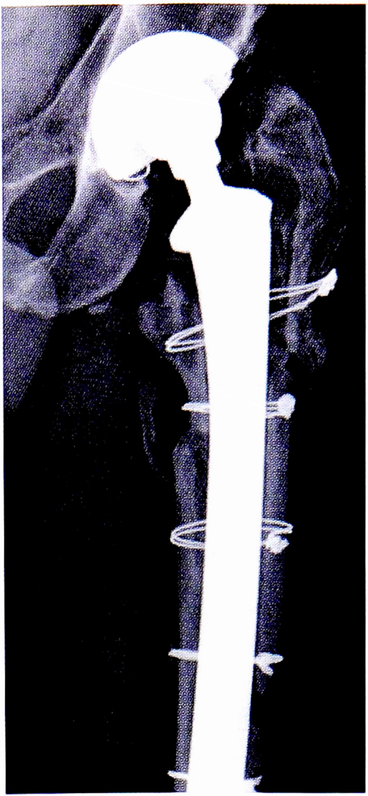 Рис. 8. Интраоперационный перипротезный перелом типа С3. Фиксация серкляжной проволокой и металлоостеосинтез пластиной (https://www.orthobullets.com/recon/5013/thaperiprosthetic-fracture).