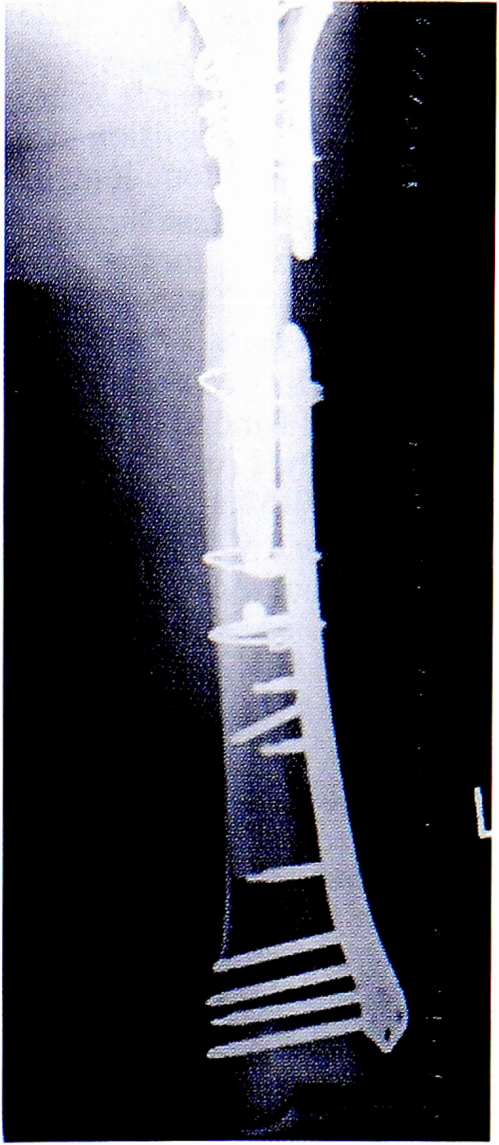 Fig. 5. Intraoperative periprosthetic fracture A3. Greater trochanter avulsion. Fixation with the trochanteric plate.