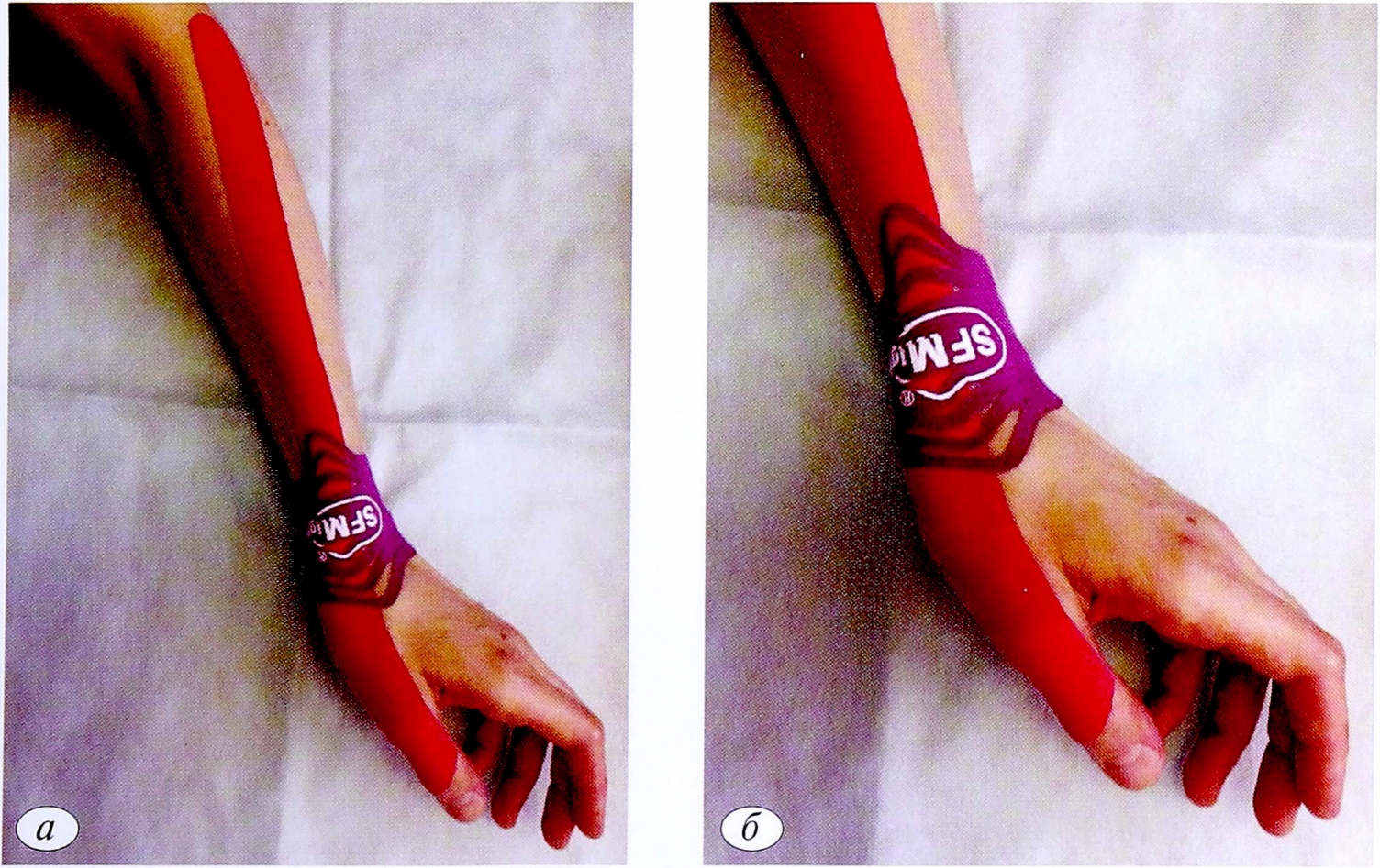 Второй тейп крепится на запястье перпендикулярно первой полосе ближе к лучевому краю кисти, захватывая область «анатомической табакерки» (см. рис. 5, б). Концы соединяют без натяжения, тейп разглаживают по всей поверхности, чтобы активировать клей.