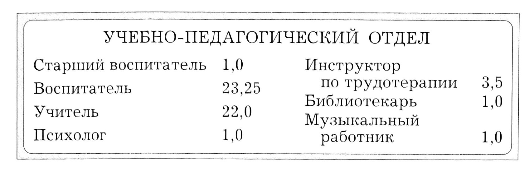 В структуре ВЦДОТ можно выделить следующие основные подразделения: лечебный отдел, учебно-педагогический отдел, инженерно-хозяйственную и административную службы. Формирование штатного расписания как на момент создания ВЦДОТ, так и по мере его развития основывалось на нормативах больницы восстановительного лечения для медицинской службы и на нормативах специализированного санатория — для педагогической. В результате в настоящее время в штате Центра имеется: врачей — 28,5 ставки, среднего медперсонала — 103,0, младшего медперсонала — 74,75 учителей и воспитателей — 46,25, прочего персонала — 124,0 ставки. Коэффициент «число персонала/число пациентов» равен 1,8, что соответствует лучшим показателям аналогичных клиник и специализированных центров за рубежом, где трудно найти примеры необоснованного «раздувания» штатов.