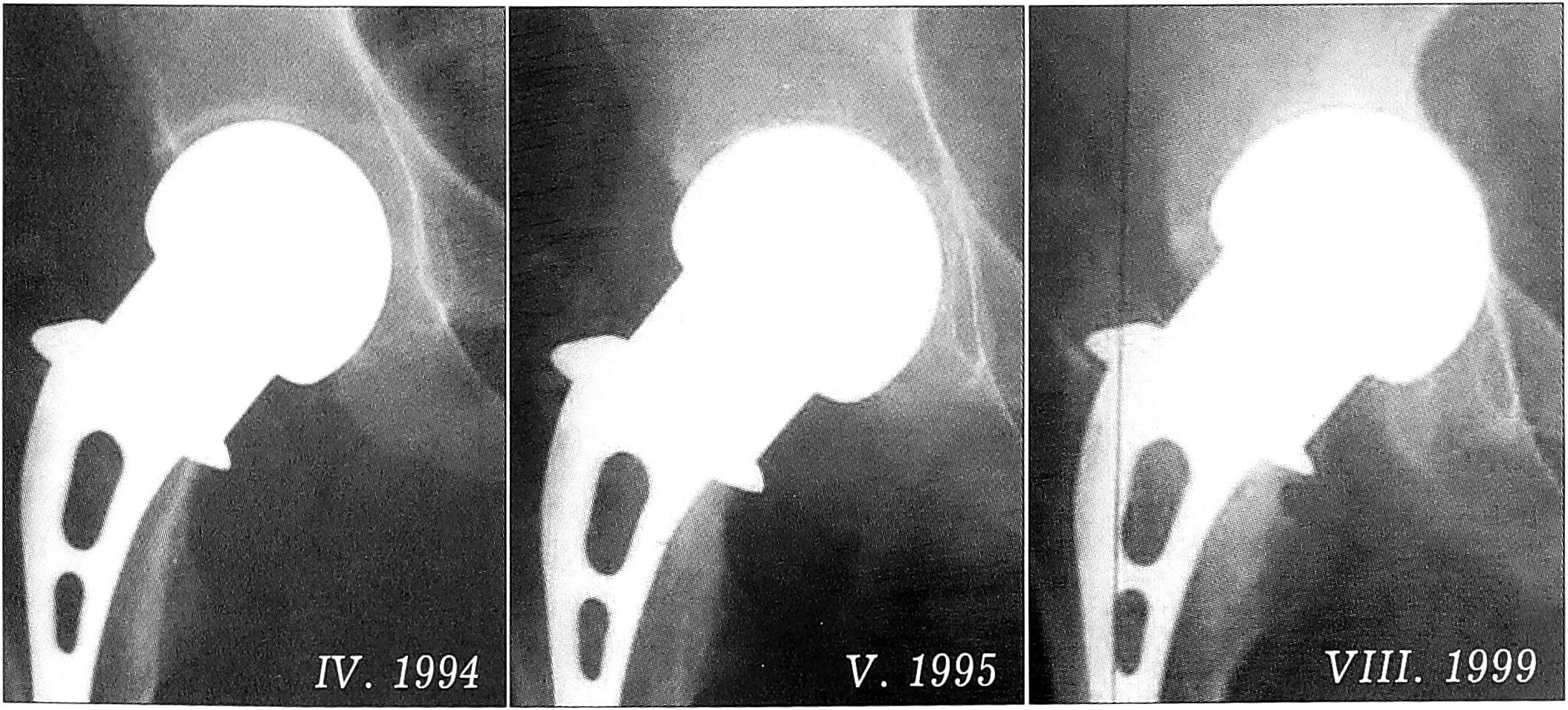 Рис. 1. Развитие протрузии головки эндопротеза Мура—ЦИТО в вертлужную впадину в течение 5 лет.