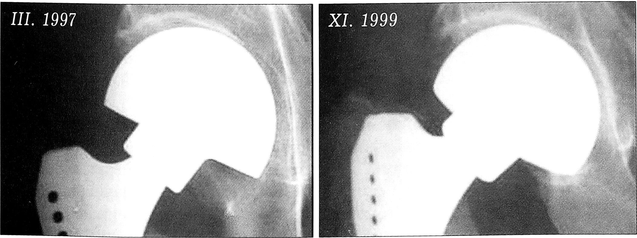 Рис. 2. Протрузия биполярной головки в вертлужную впадину в течение 2 лет.
