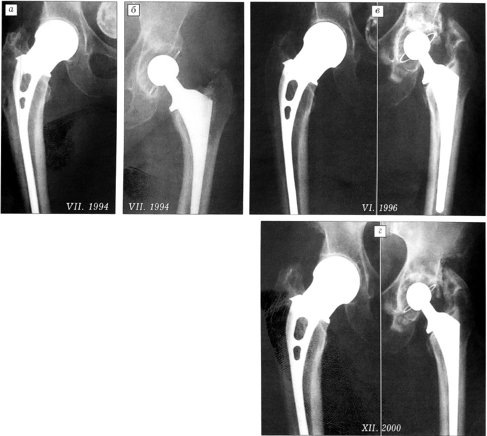 Рис. 3. Больная А. 86 лет. В 1992 г. произведено эндопротезирование правого тазобедренного сустава протезом Мура—ЦИТО, в 1994 г. — эндопротезирование левого тазобедренного сустава тотальным эндопротезом с фиксацией на костном цементе. а — через 2 года после эндопротезирования правого, б — непосредственно после эндопротезирования левого тазобедренного сустава; в — изменений со стороны гемипротеза через 4 года после установки нет, отмечается «проваливание» цементной ножки Вi-metriс через 2 года после операции; г — положение гемипротеза через 8 лет после операции не изменилось, положение цементного эндопротеза через 6 лет стабилизировалось.