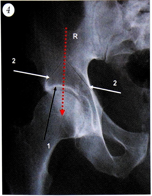 - При медиальном отклонении сурсила от горизонтальной оси таза менее 8° или его латеральном отклонении использование гемипротезов противопоказано из-за высокого риска протрузии головки протеза в вертлужную впадину в течение первых лет. В этих случаях абсолютно показано тотальное эндопротезирование тазобедренного сустава.