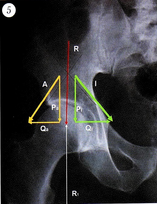 В этом случае положение сурсила будет строго горизонтальным, т.е. силы выталкивания и вправления головки бедренной кости будут равны. При нарушении мышечного баланса вектор результирующей силы может иметь краниомедиальное или краниолатеральное направление, что обусловит отклонение сурсила в медиальную или латеральную сторону. Медиальное отклонение сурсила и вектора результирующей силы указывает на то, что вектор силы отводящих мышц имеет более горизонтальное направление, а вектор силы подвздошной мышцы — более вертикальное. Согласно правилу векторов, горизонтальная составляющая вектора силы отводящих мышц будет увеличиваться, а подвздошной мышцы — уменьшаться. Таким образом, в этом случае будет иметь место тенденция к вывихиванию головки бедренной кости из вертлужной впадины.
