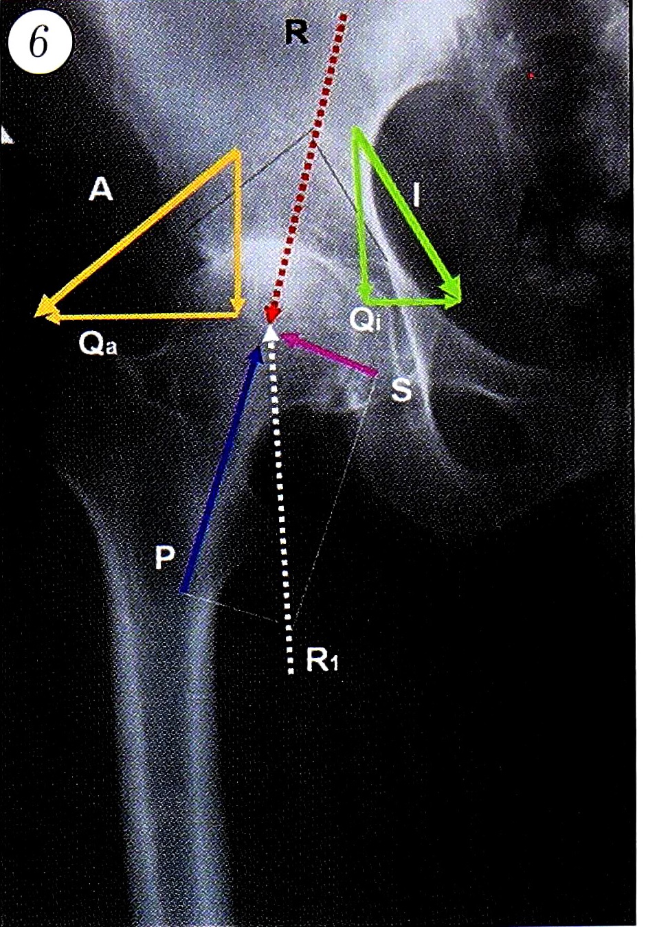 Латеральное отклонение сурсила и вектора результирующей силы свидетельствует о диаметрально противоположных нарушениях в тазобедренном суставе. При этом более горизонтальное направление будет иметь вектор силы подвздошной мышцы, а направление вектора силы ягодичных мышц будет более вертикальным (рис. 7). Следовательно, горизонтальная составляющая вектора силы подвздошной мышцы будет увеличиваться, а ягодичных мышц — уменьшаться. В этом случае проявляется тенденция к протрузии головки бедренной кости в вертлужную впадину. В момент опоры срезающий компонент вектора силы реакции опоры будет иметь медиальное направление, еще больше нарушая баланс сил, стремясь также вдавить головку бедренной кости в вертлужную впадину. Суммарное значение горизонтальной составляющей вектора силы подвздошной мышцы и срезающего компонента силы реакции опоры превысит суммарное значение вектора силы ягодичных мышц и давящего компонента силы реакции опоры. Чем больше будет сдвиг баланса сил в медиальном направлении, тем существеннее окажется латеральное отклонение сурсила от вертикальной оси и соответственно выраженнее тенденция к протрузии головки бедренной кости, особенно в условиях нарушения ремоделирования костной ткани.