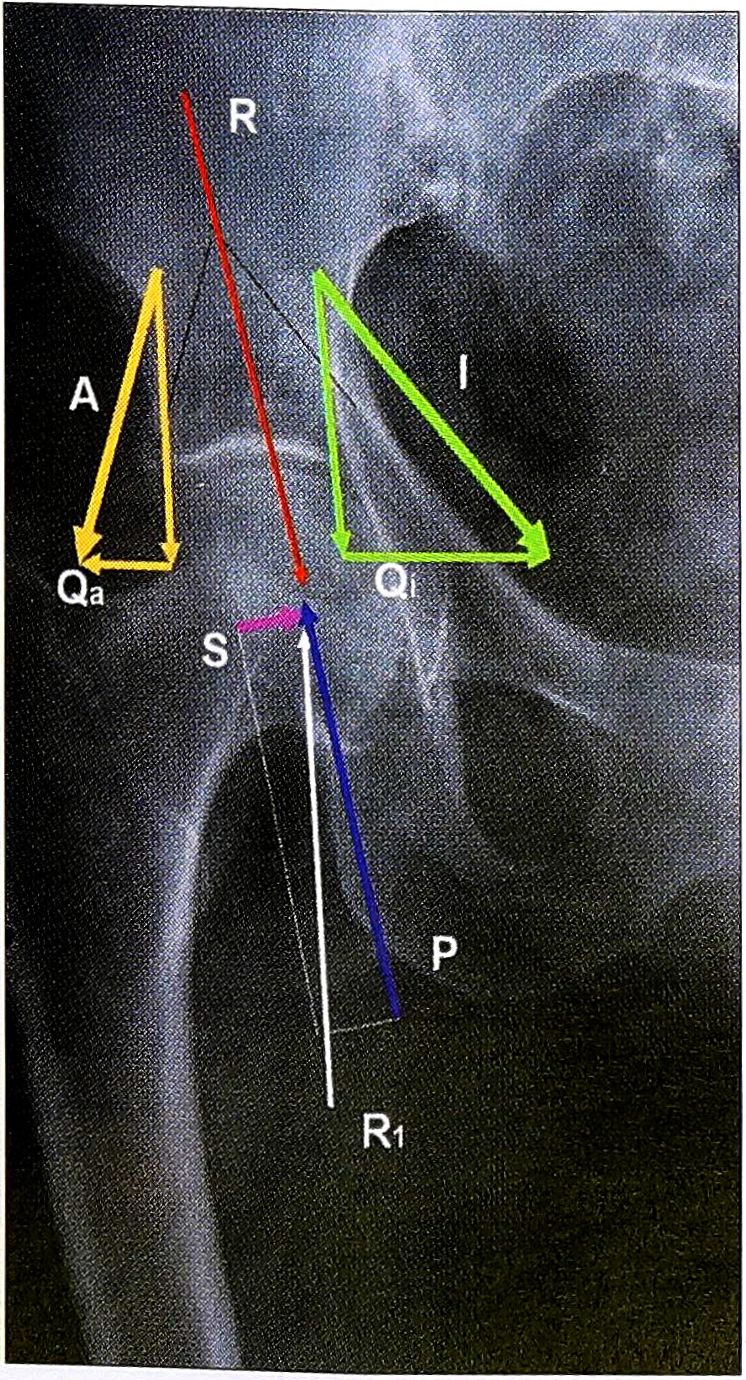 Рис. 5. Распределение векторов сил при горизонтальном расположении сурсила. А — вектор силы отводящих мышц бедра; I — вектор силы подвздошной мышцы; Ра и Рi — вертикальные составляющие, (Qа и Qi — горизонтальные составляющие, R — результирующая сила, R1 — сила реакции опоры.