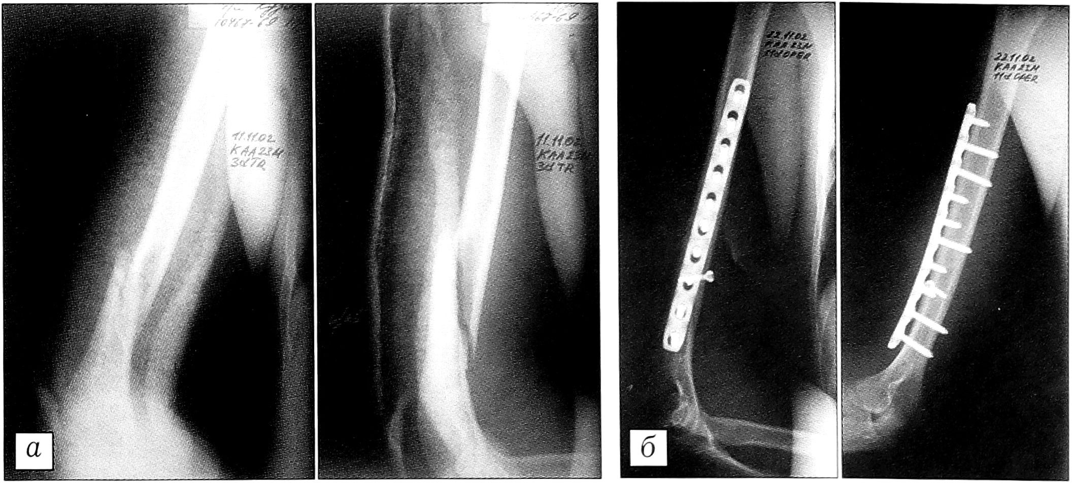 Рис. 2. Больной К. Диагноз: винтообразный перелом нижней трети правой плечевой кости. а — рентгенограммы при поступлении; б — после остеосинтеза пластиной LCP.