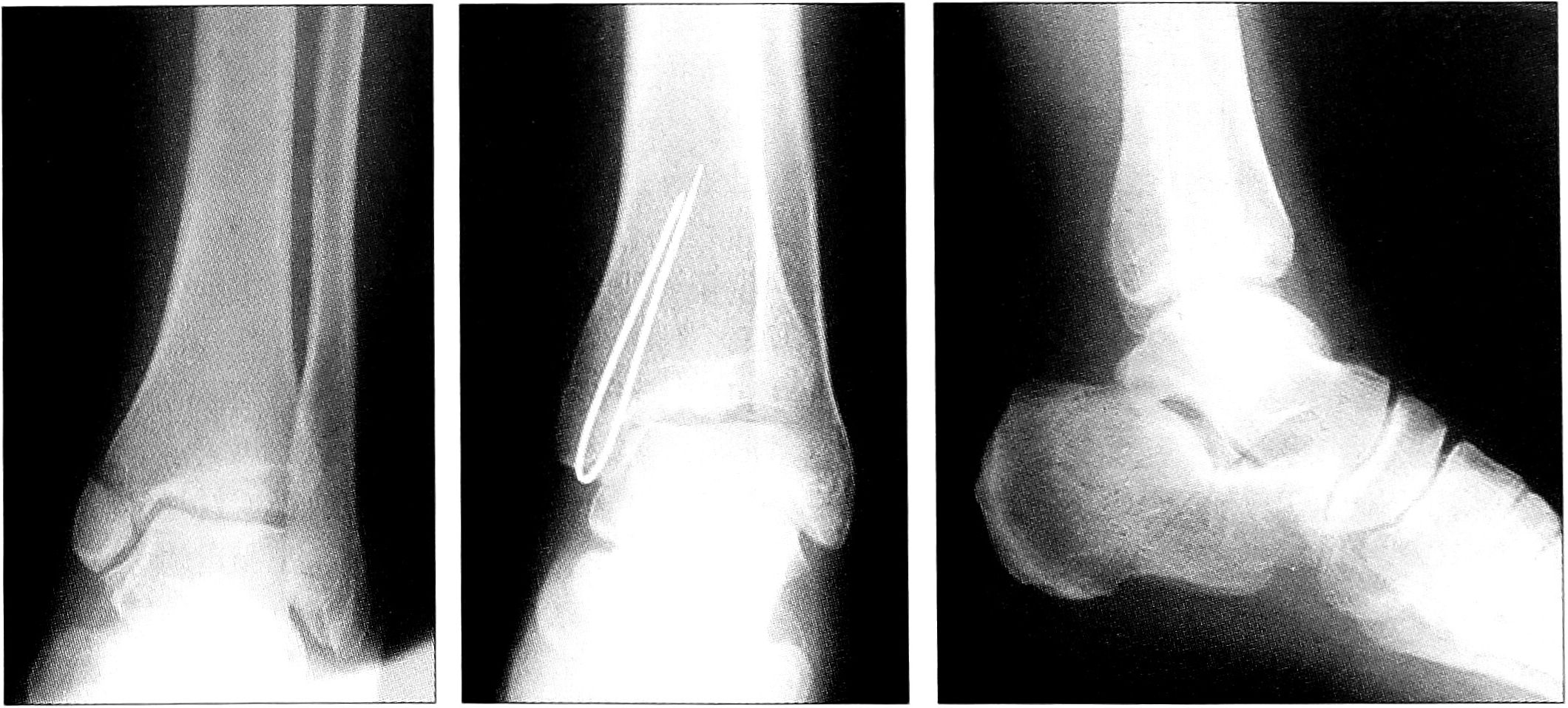 У 10 больных с переломами внутренней лодыжки после закрытой репозиции был произведен перкутанный остеосинтез V-образной спицей. Примером может служить больная Е.,20 лет, которой через 2 дня после травмы (апикальный перелом внутренней лодыжки) под контролем ЭОП выполнен перкутанный остеосинтез V-образной спицей; на 2-е сутки после операции начаты активные занятия лечебной гимнастикой без внешней иммобилизации (рис. 3).