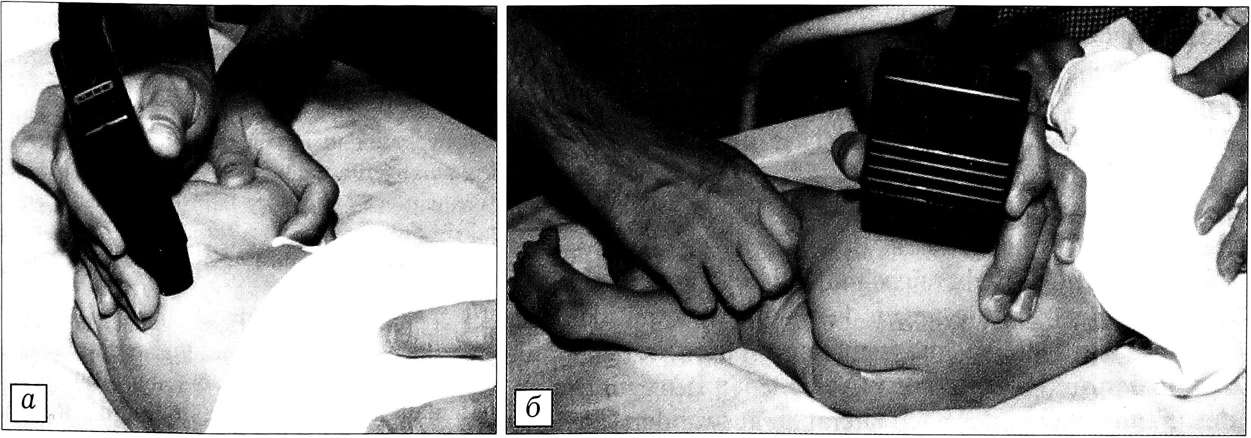 Рис. 2. Позиции ультразвукового датчика: а — обследование без фиксации поясницы ребенка рукой, б — с фиксацией поясницы, плеча и сгибанием бедра под углом 30-60°.