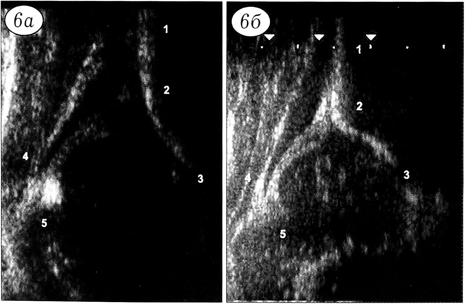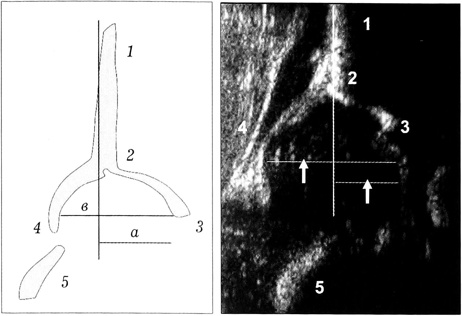Рис. 3. Продольная ультрасонограмма нормального тазобедренного сустава новорожденного. 1 — подвздошная кость; 2 — костный выступ крыши; 3 — дно впадины; 4 — латеральная капсула сустава; 5 — бедренная кость (остальные обозначения см. в тексте).