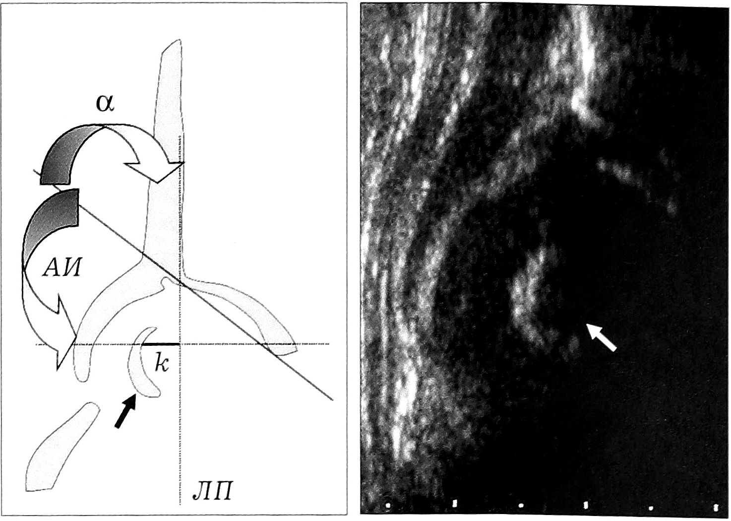 Рис. 4. Продольная ультрасонограмма нормального тазобедренного сустава ребенка 4-месячного возраста. Имеется ядро оссификации головки бедра (стрелка). АИ — ацетабулярный индекс; ЛП — линия Перкинса (остальные обозначения см. в тексте).
