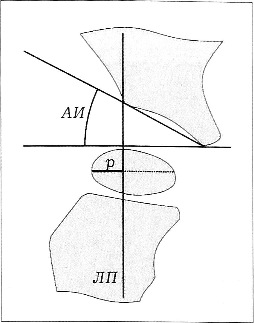 Рис. 5. Схема измерения на рентгенограммах расстояния р и ацетабулярного индекса (АИ). ЛП — линия Перкинса.