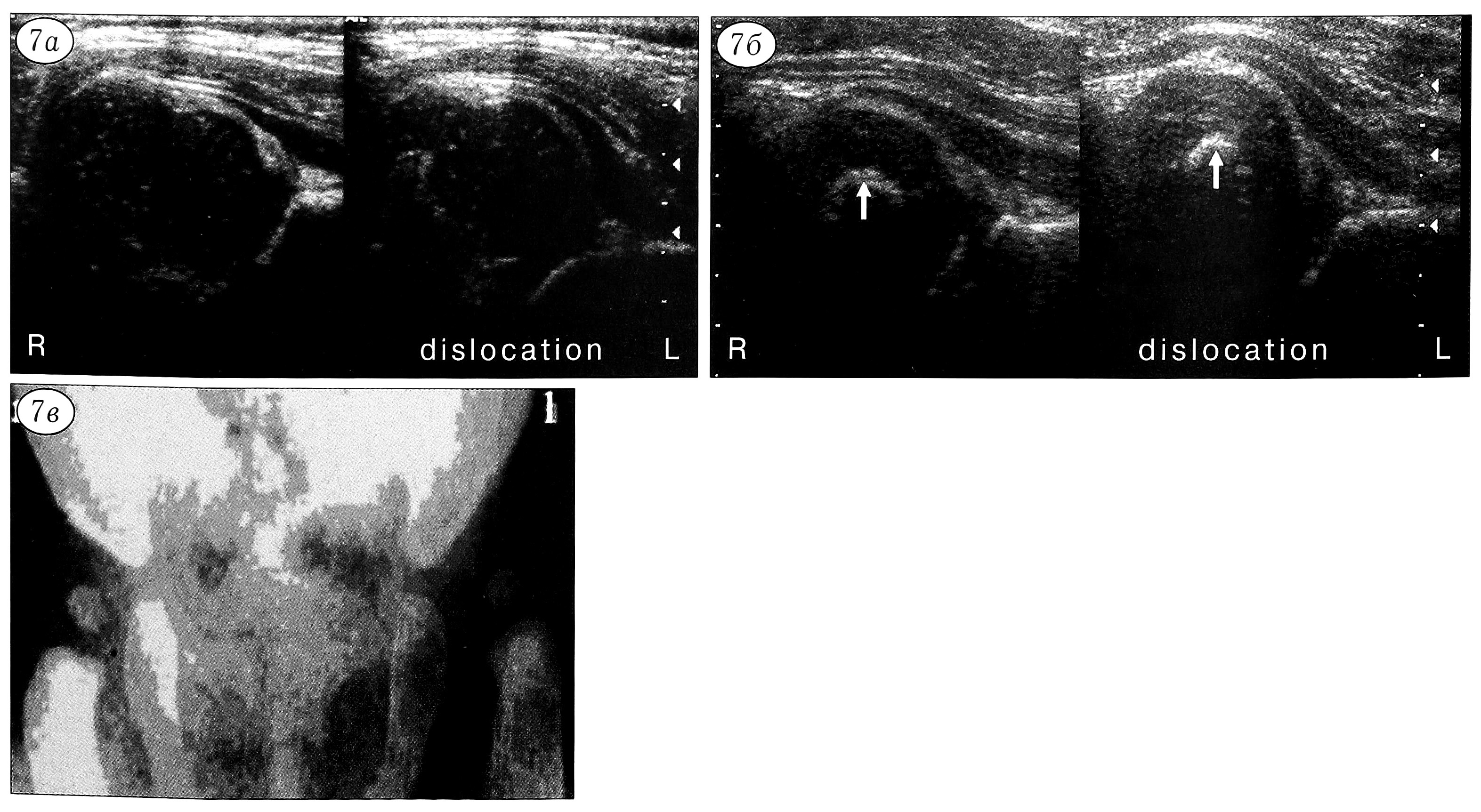 Рис. 7. Ультрасонограммы (а, б) и рентгенограмма (в) тазобедренных суставов больной 3-й группы. а — при рождении головка правого бедра не полностью покрыта ацетабулярной крышей; б — к 5 мес головка правого бедра сублюксирована в латеральную сторону (стрелкой показан центр окостенения); в — подвывих подтвержден рентгенологически.