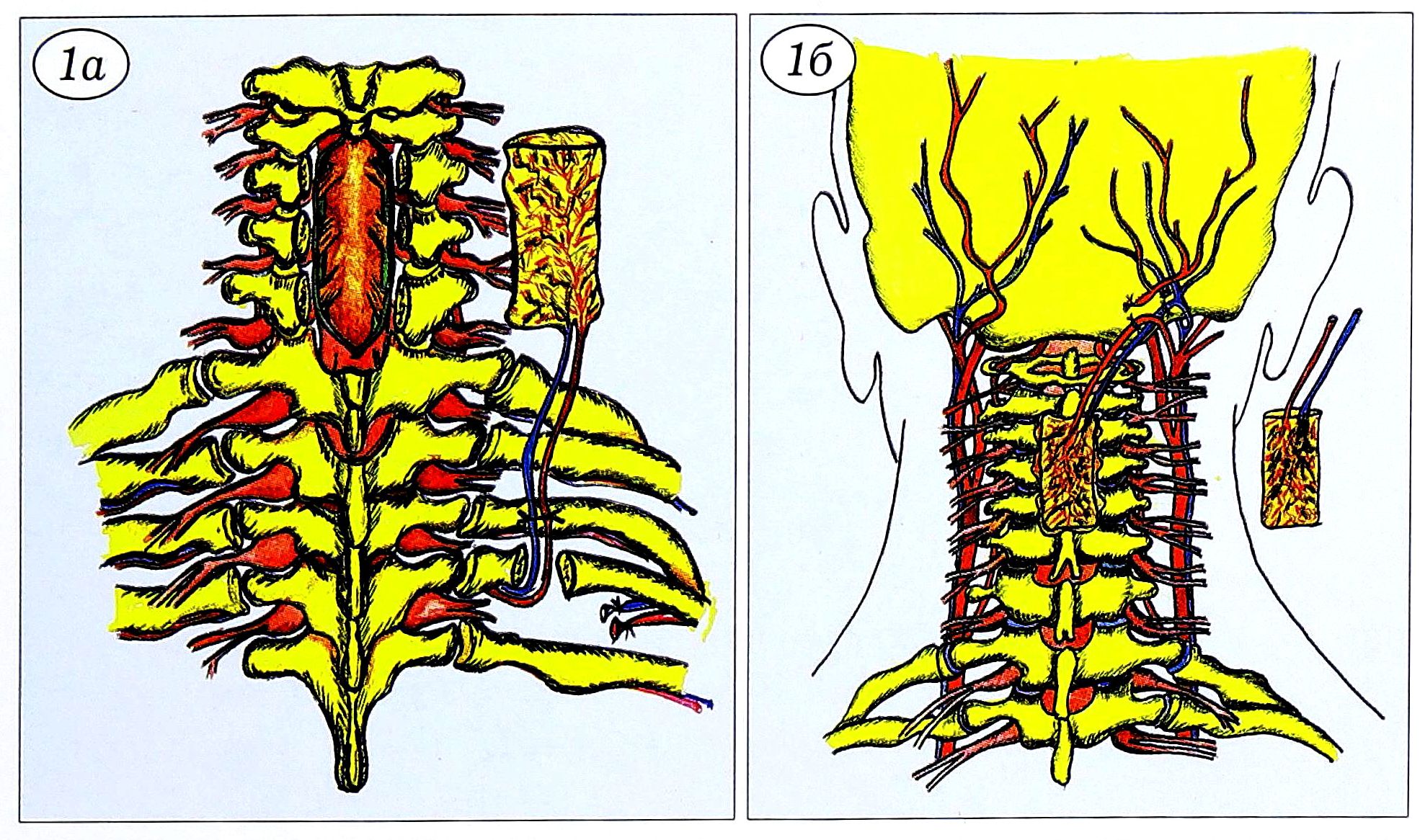 Рис. 1. Схема операции свободной оментомиелопексии. а — микроанастомозы с межреберной артерией и веной; б — микроанастомозы с затылочной артерией и веной.