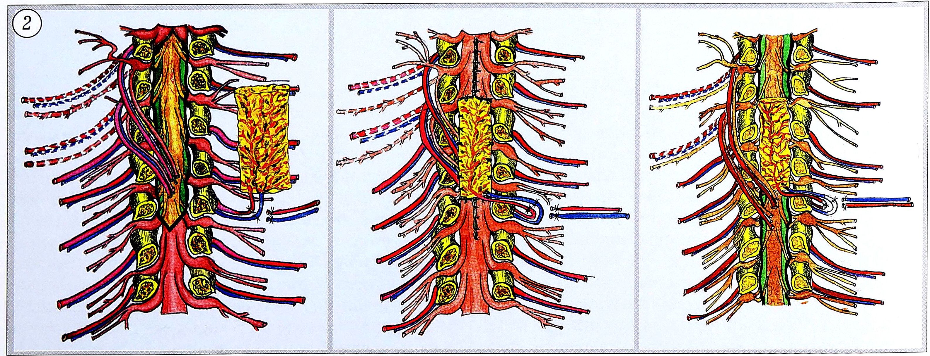 3. Fig. 2. Scheme of operations for moving the intercostal neurovascular bundle to the distal parts of the spinal cord with free omentomyelopexy. Drawings by V.V. Trotsenko