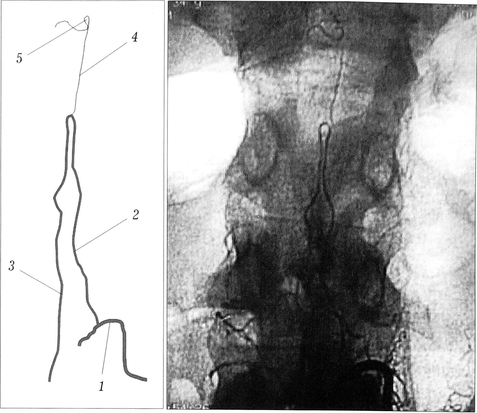 4. Fig. 3. Spinal angiogram of patient L., 29 years old. Occlusion of the anterior spinal artery. 1 - lumbar artery L1; 2 - Adamkevich's artery; 3 - descending section of the anterior spinal artery; 4 - ascending department of the anterior spinal artery; 5 - occlusion of the anterior spinal artery.