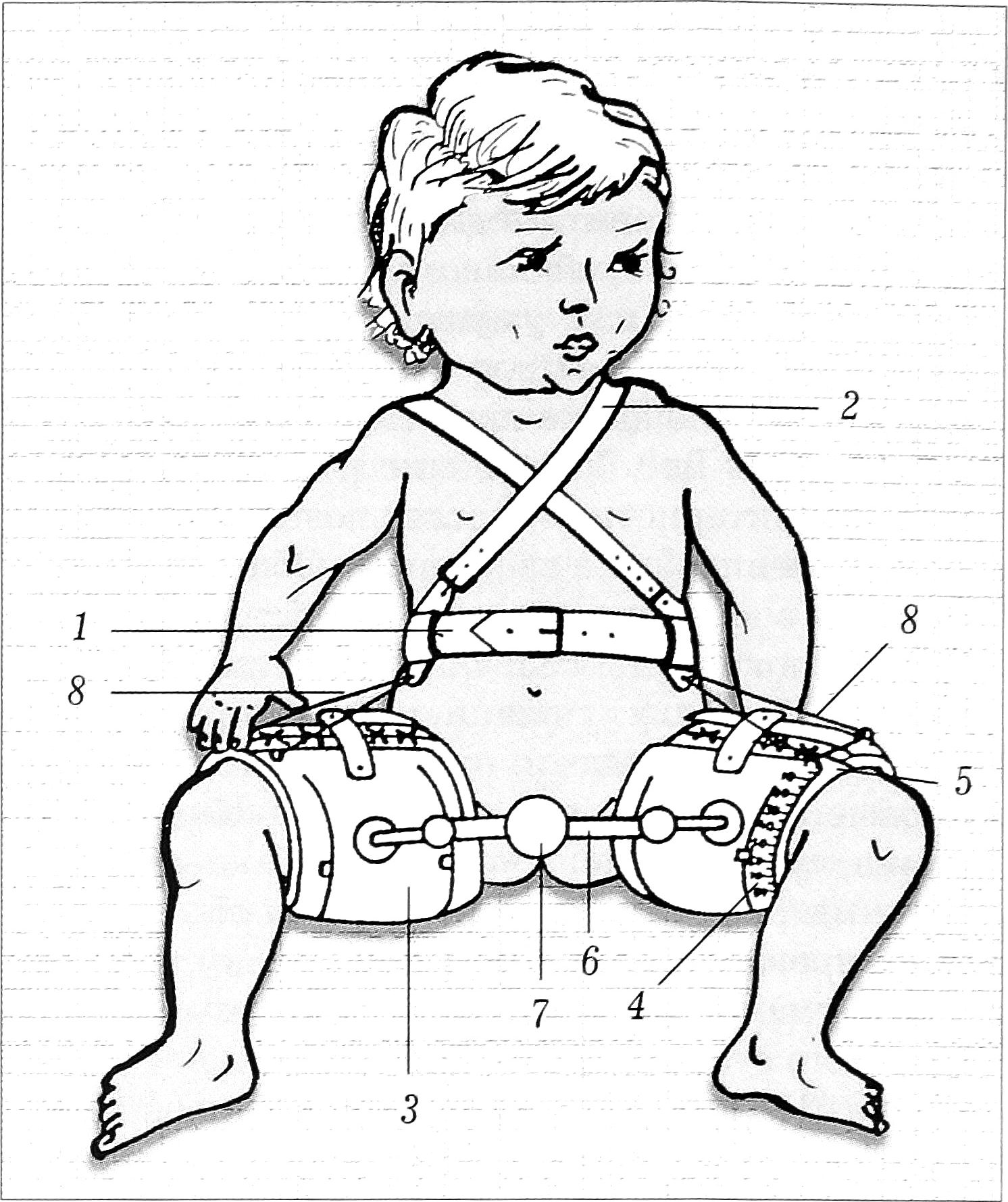 Постепенное вправление головки бедра и дальнейшее лечение проводится непосредственно в устройстве. Грудные лямки перекрещивают на спине ребенка, поясной ремень застегивают на уровне реберной дуги. Кожухи с бедренными манжетами надевают на бедра больного и застегивают пряжкой. Первоначально отведение бедер оставляют таким, какое оно есть в естественных условиях. Для этого выдвигают штоки из стержней-цилиндров на заданную величину, бедра сгибают до 90°, для чего уменьшают длину тяг, и устанавливают шарнир в нефиксированном положении. Таким образом, одновременно с фиксацией бедер в устройстве обеспечиваются следующие дозированные движения в суставах: сгибание—разгибание в пределах 40° при разведенных и умеренно приведенных ногах, ротационные движения внутрь. Через 2-3 нед у ребенка, как правило, устраняется приводящая контрактура, происходит вправление головки бедра. Увеличивая отведение, конечностям придают аксиальное положение, при этом остаются возможными сгибание—разгибание, приведение—отведение в пределах 20°, а также внутренняя ротация.
