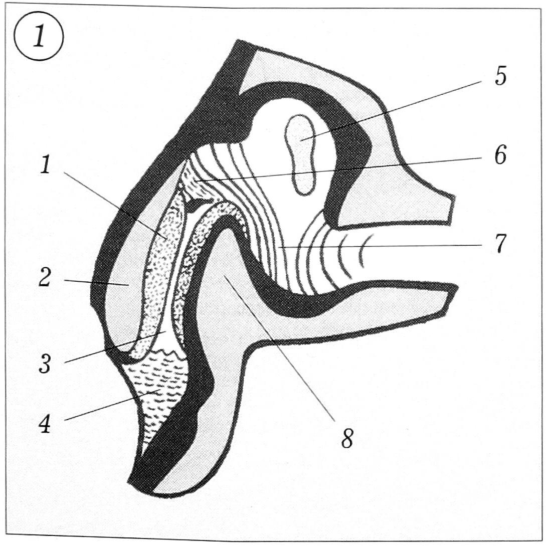 Рис. 1. Схема строения дугоотростчатого сустава (вид сбоку) [9]. 1 — хрящ суставной поверхности; 2 — нижний суставной отросток; 3 — суставная щель; 4 — нижний заворот сустава; 5 — спинномозговой нерв; 6 — верхний заворот сустава; 7 — желтая связка; 8 — верхний суставной отросток.