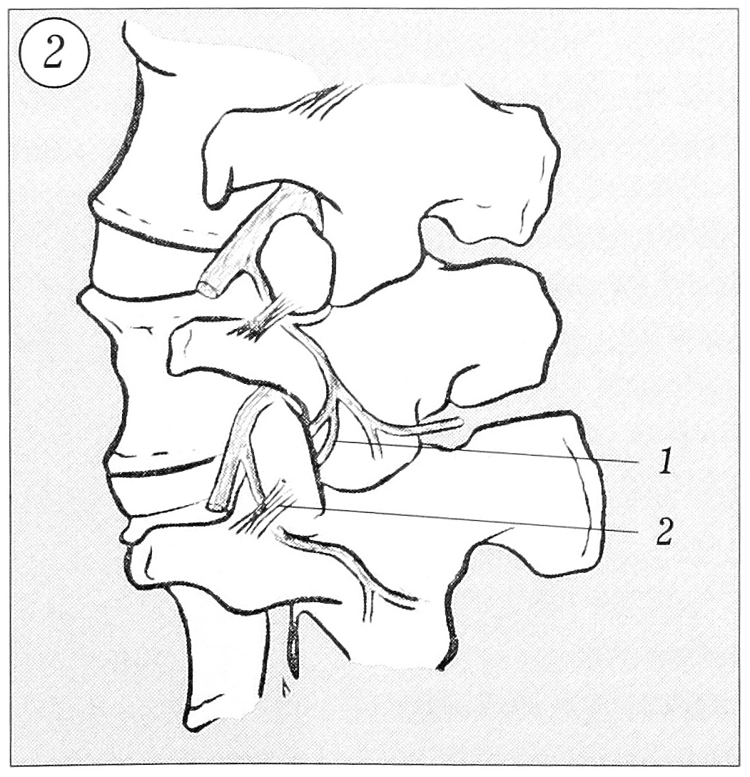 Рис. 2. Схема иннервации дугоотростчатого сустава [37]. Медиальная веточка (1) продолжается дистально и посылает множественные тонкие веточки к медиальной поверхности верхнего отдела фасетки (2).