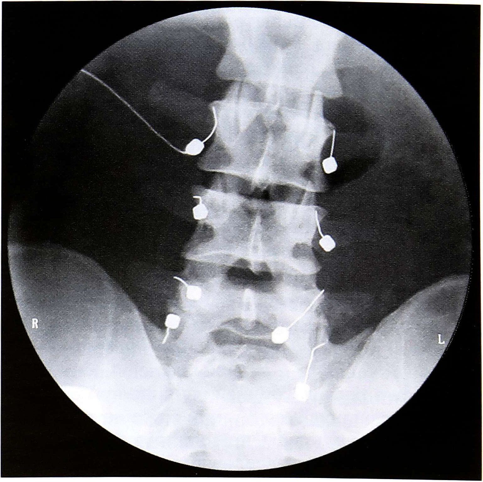 Рис. 3. Больной К. Рентгенограмма во время операции радиочастотной деструкции фасеточных нервов.