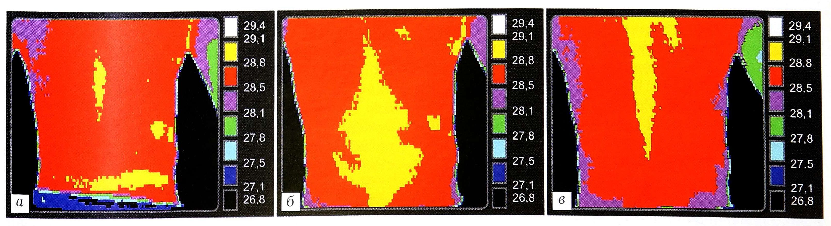 Рис. 4. Больной К. Термограммы поясничной области. а — до операции; б — через сутки после радиочастотной дерецепции фасеток: отмечается диффузная гипертермия поясничных паравертебральных зон («горячая» острая фаза денервационного синдрома); в — через неделю после операции: отсутствие термоасимметрии в поясничной области на фоне ее умеренной гипотермии (редукция «горячей» фазы денервационного синдрома).