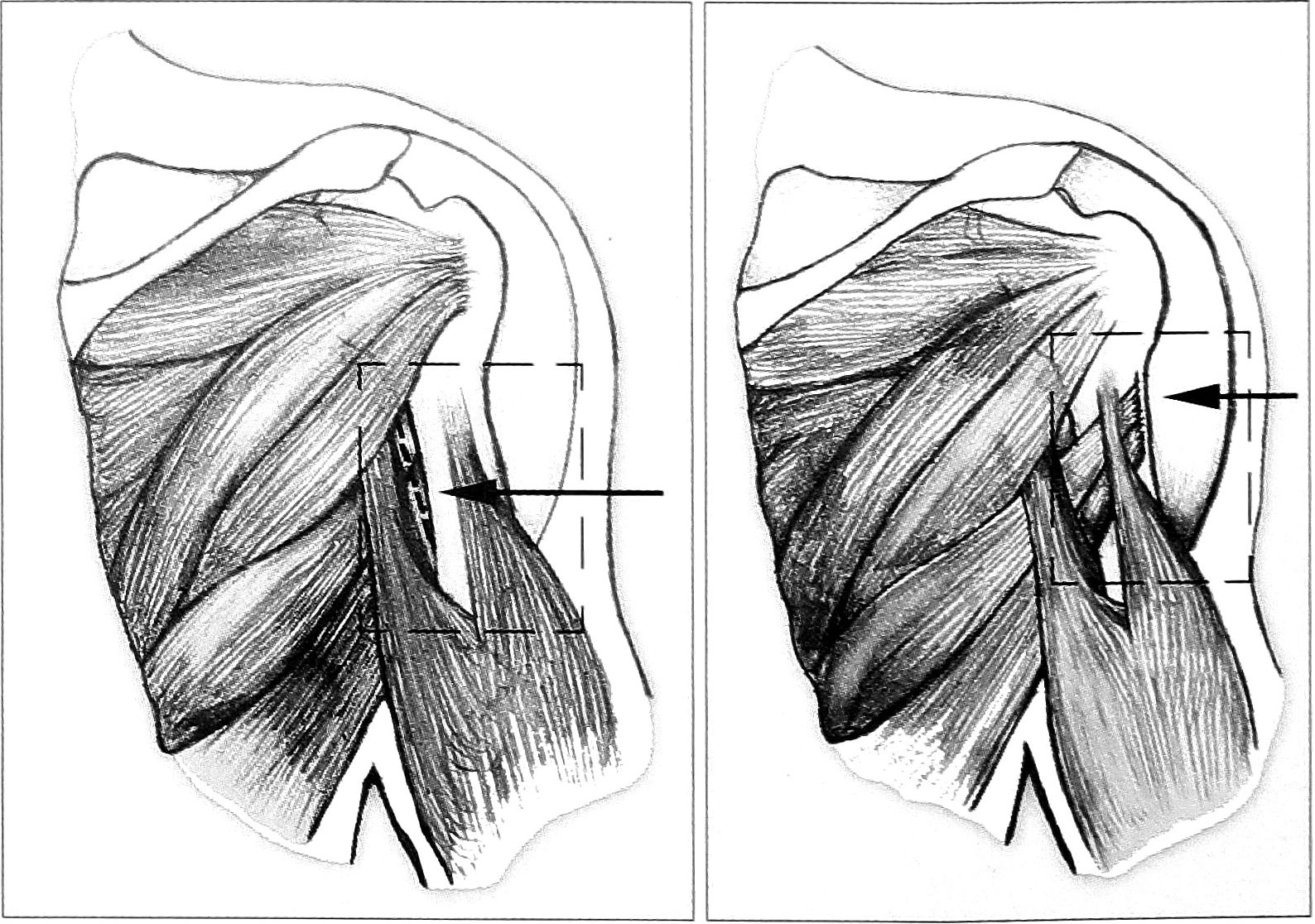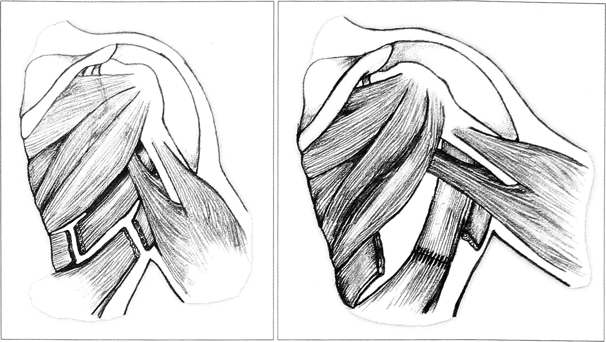 В 14 случаях произведена операция Эпископо в различных модификациях. Из них 9 больным с нестабильностью плечевого сустава I степени выполнена операция Эпископо в модификации, предложенной О.В. Дольницким [1]. Доступ осуществляли по дельтовидно-грудной борозде, выделяли и Z-образно рассекали сухожилие большой грудной мышцы. Затем выделяли сухожилия большой круглой и широчайшей мышц спины, отсекали их от плечевой кости, переводили на ее задненаружную поверхность и фиксировали трансоссально; сухожилие большой грудной мышцы сшивали с удлинением (рис. 2). В послеоперационном периоде в течение 5-12 дней проводили манжеточное вытяжение верхней конечности в положении отведения плеча до угла 90° и его наружной ротации до 70°. Затем накладывали гипсовую торакобрахиальную повязку в таком же положении конечности на 3 нед. У 5 больных со II степенью нестабильности плечевого сустава операция Эпископо была дополнена тенотомией подлопаточной мышцы и передней капсулотомией плечевого сустава.