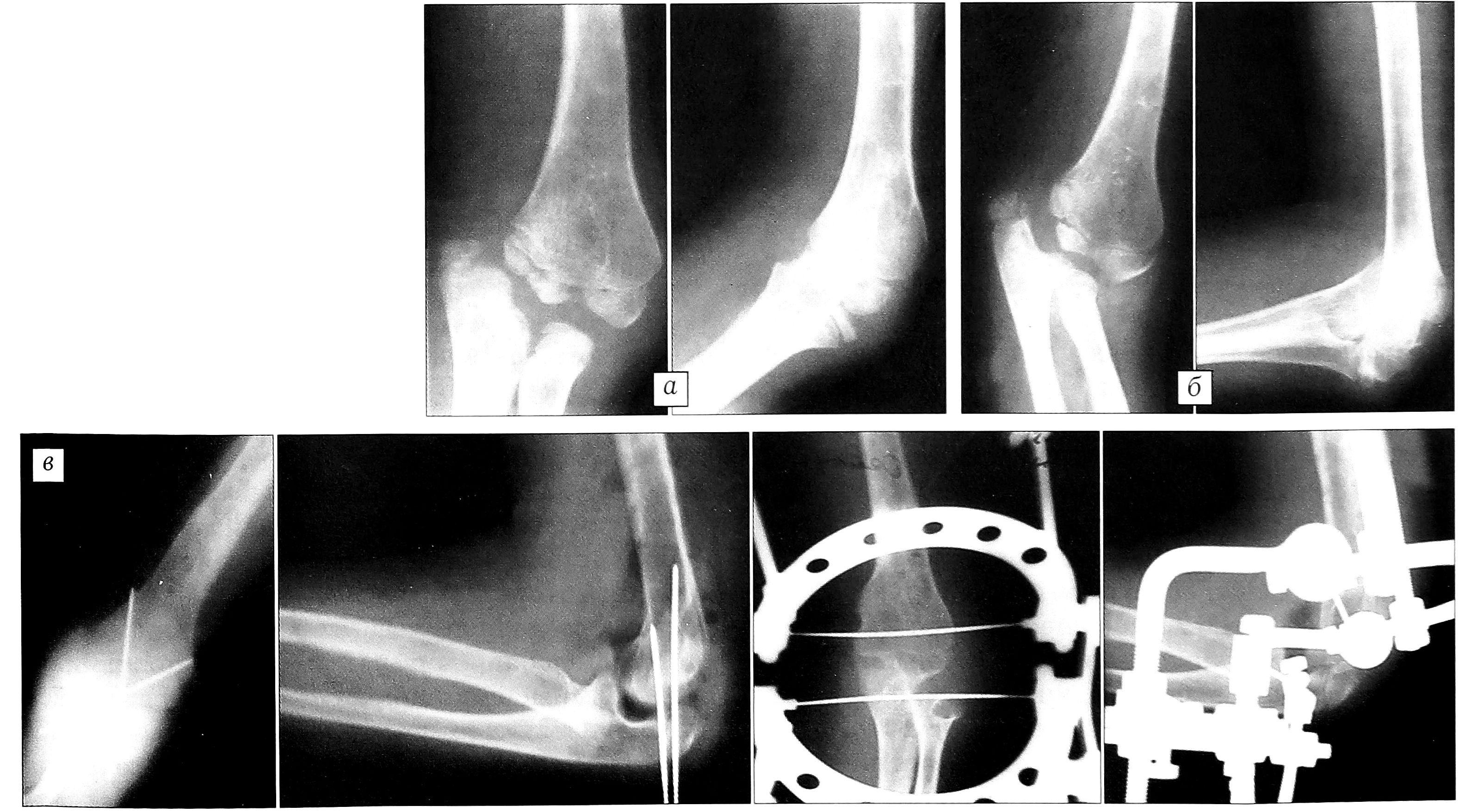Неудовлетворительный результат отмечен нами в одном случае (1,8%). Больному О. с приводящей внутреннеротационной контрактурой плечевого сустава вследствие родового повреждения плечевого сплетения в возрасте 6 лет были выполнены деротационная остеотомия плечевой кости в нижней трети и остеосинтез металлической пластиной. Через 4 года после операции сформировалась варусная деформация локтевого сустава, наступил подвывих (рис. 5, а), а через 6 лет — медиальный вывих костей предплечья (рис. 5, б). Для коррекции данной деформации потребовалось этапное оперативное лечение — открытое устранение вывиха костей предплечья, моделирующая артропластика, разработка движений в аппарате Волкова—Оганесяна и длительное реабилитационное лечение (рис. 5, в).