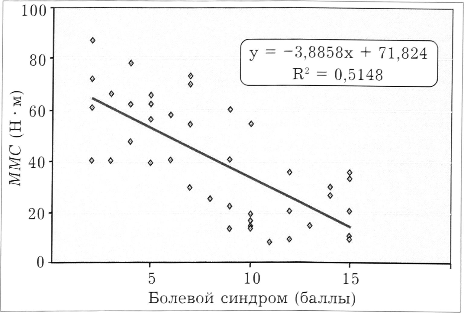ММСинд. = 71,8 - 3,89 ОБС, r = - 0,717, п = 43, р < 0,01 (где ММСинд. — максимальный момент индикаторной группы мышц, ОБС — оценка болевого синдрома).