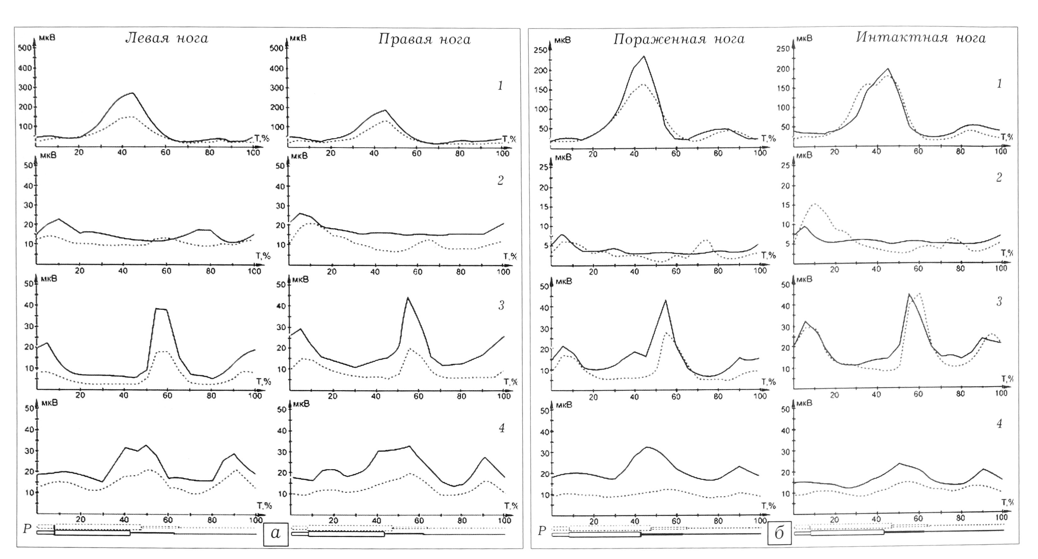 Рис. 2. Графики распределения электрической активности мышц за шаг у больных 1-й (а) и 2-й (б) группы. Пунктирные линии — до лечения, сплошные линии — после курса лечения; Р — подограмма; 1 — икроножная, 2 — большая ягодичная, 3 — крестцово-остистая, 4 — ромбовидная мышцы.