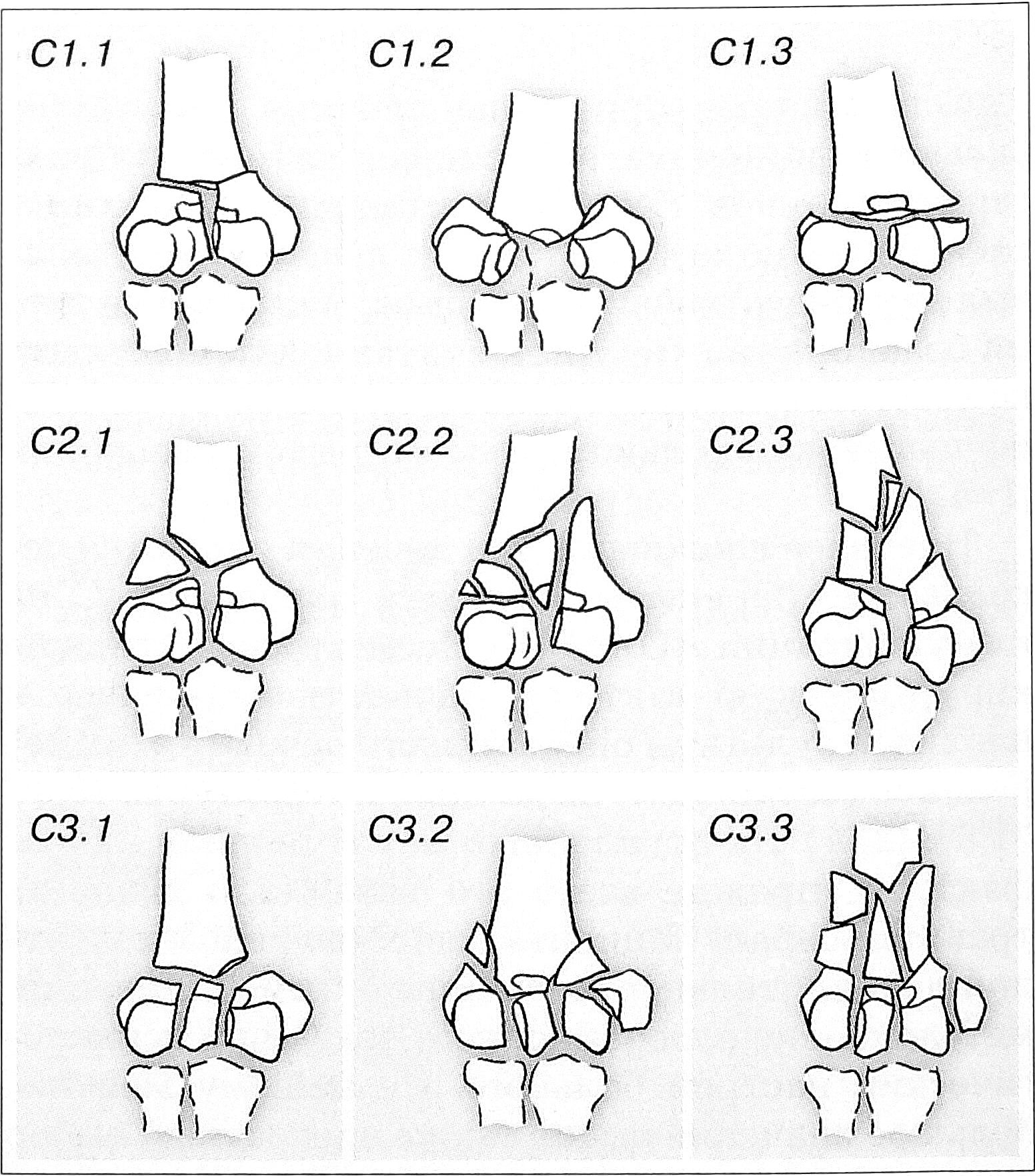 Вероятно, остеосинтез суставных отломков с помощью внутрикостных фиксаторов обладает преимуществами перед фиксацией пластинами, так как не приводит к травмированию околосуставных мягкотканных структур при движениях в суставе. Однако он показан не при всех типах переломов. Внутрикостные фиксаторы (болты, винты, спицы) не позволяют создать необходимую стабильность при наличии трех и более отломков (переломы типа С2 и СЗ). В подобных случаях в качестве своеобразной шины приходится применять пластины.