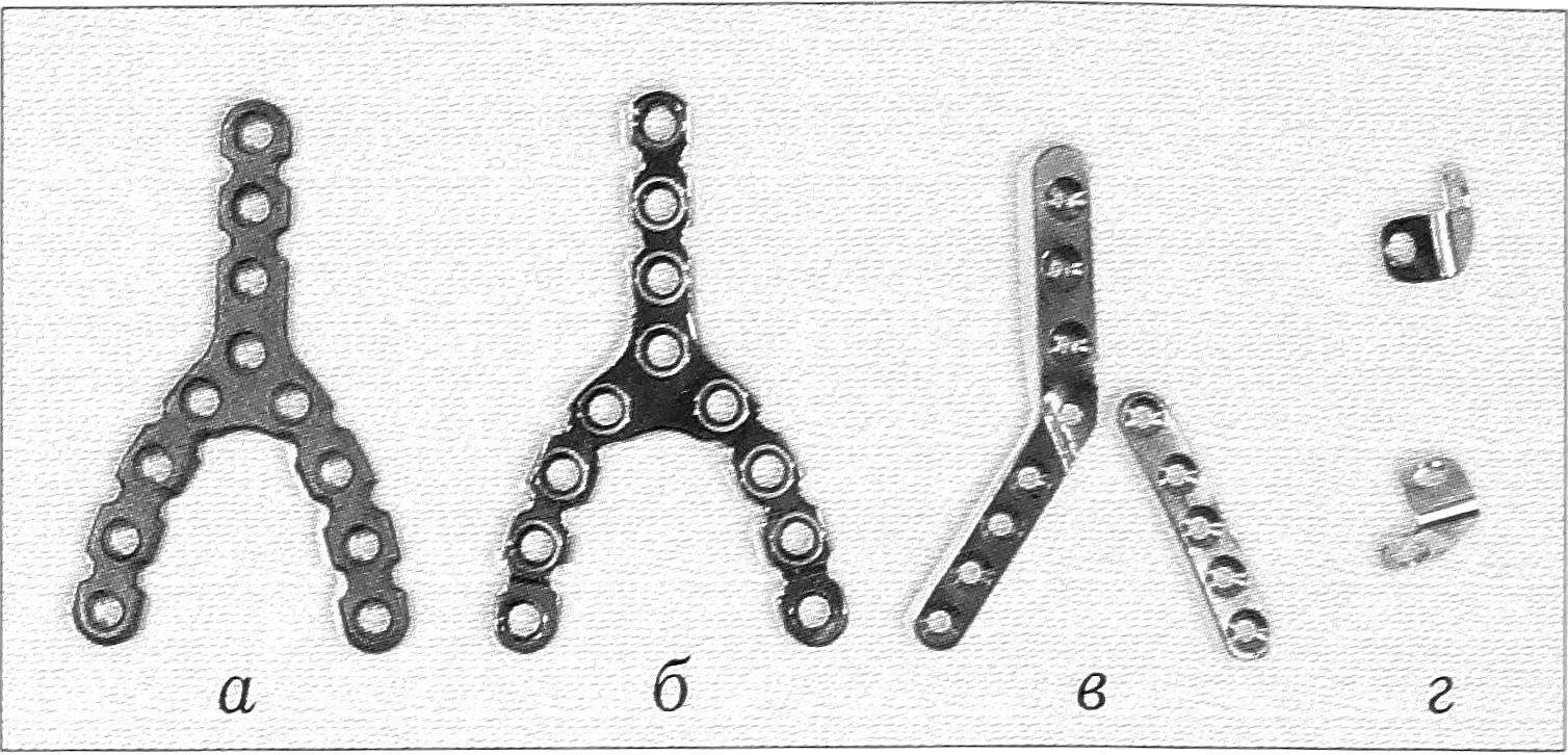 Рис. 2. Пластины для остеосинтеза мыщелка плечевой кости: а — Y-образная простая; б — Y-образная компрессирующая; в — сборная; г — скобы.