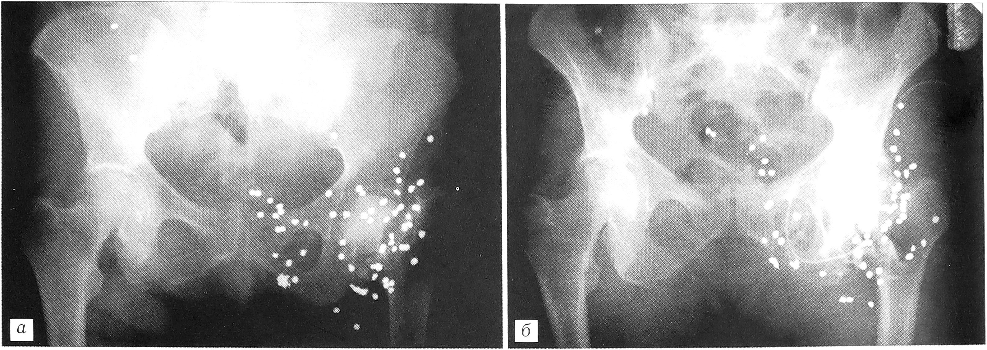 Рис. 3. Рентгенограмма (а) и фистулограмма (б) больной Б. 64 лет: остеомиелит костей, образующих левый тазобедренный сустав, после огнестрельного ранения с переломом шейки бедра.
