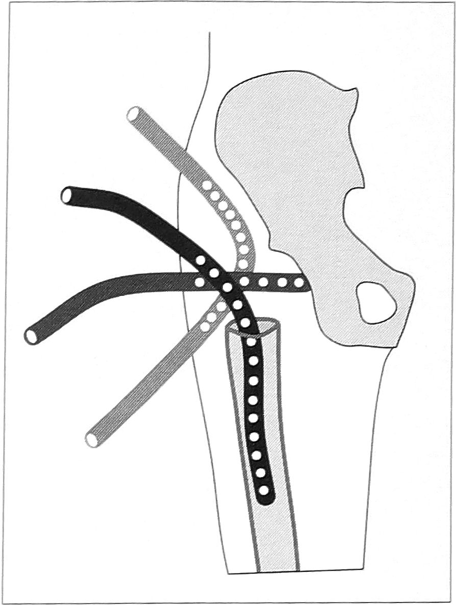 Если в ходе операции костномозговой канал не вскрывался, рану дренировали двумя дренажами: в том же направлении над ушитыми мышцами проводили еще один двухполюсный дренаж. После завершения операции ногу фиксировали в деротационной шине с ранее приданной ей установкой отведения и нейтральной ротации.